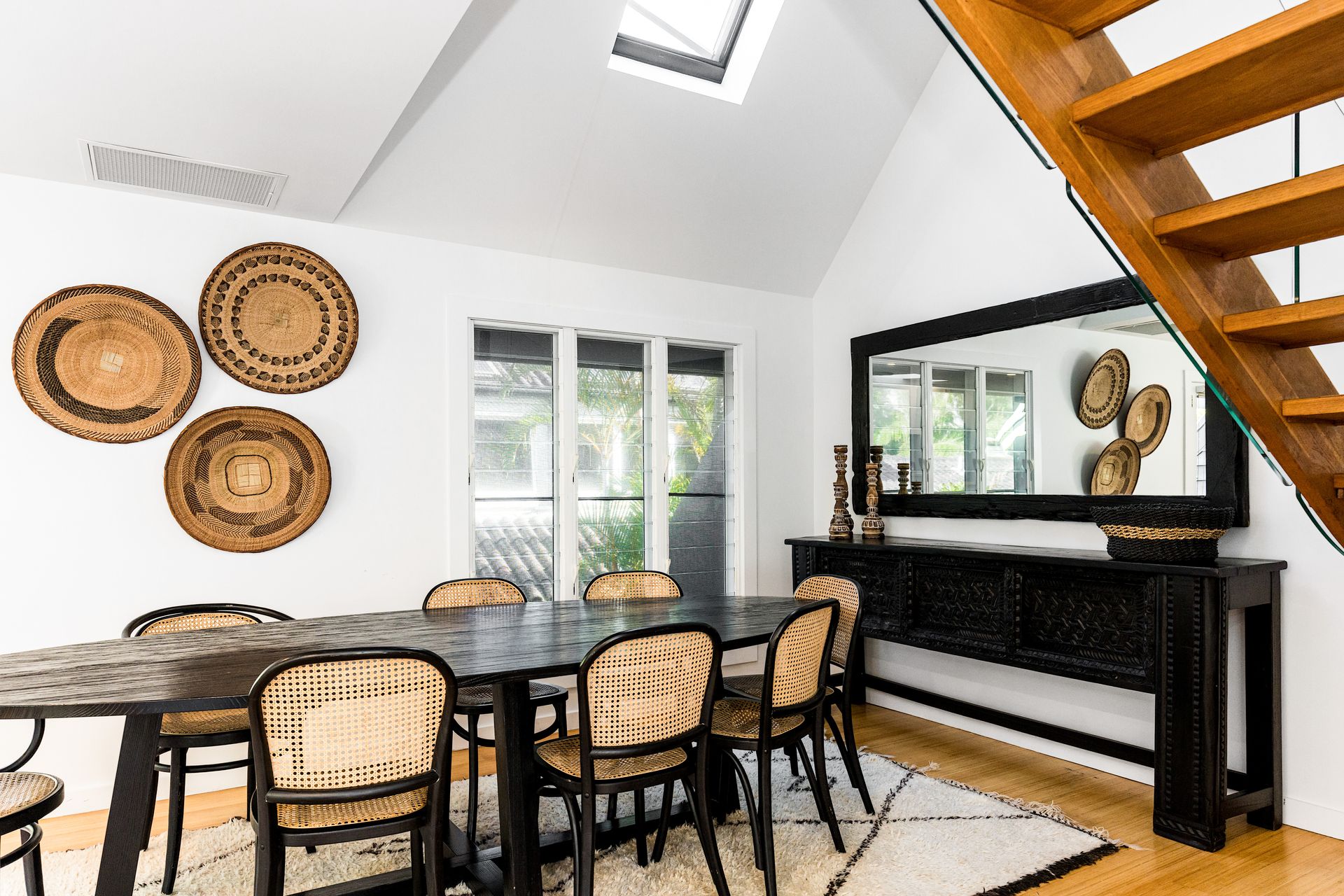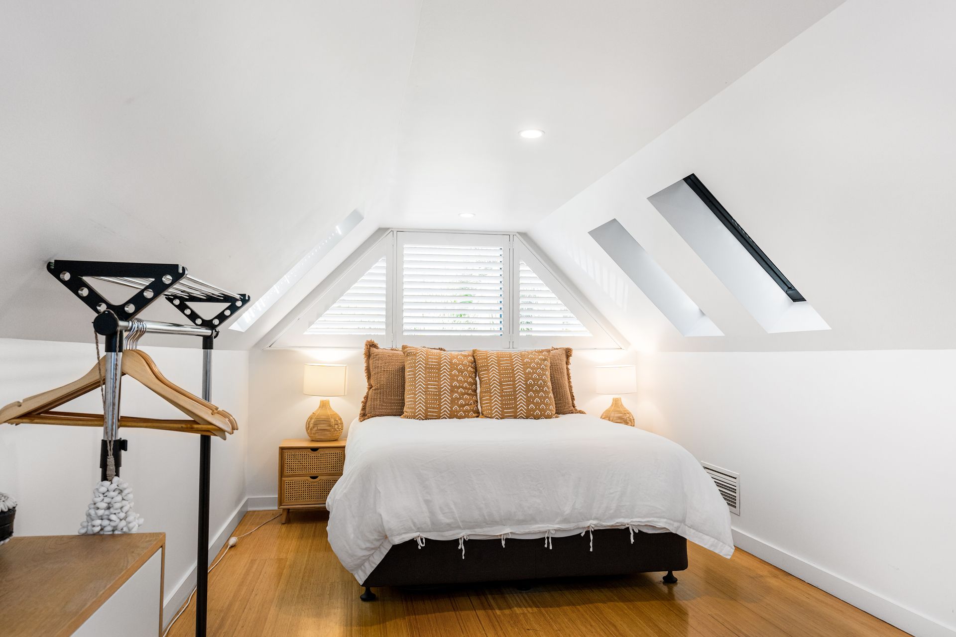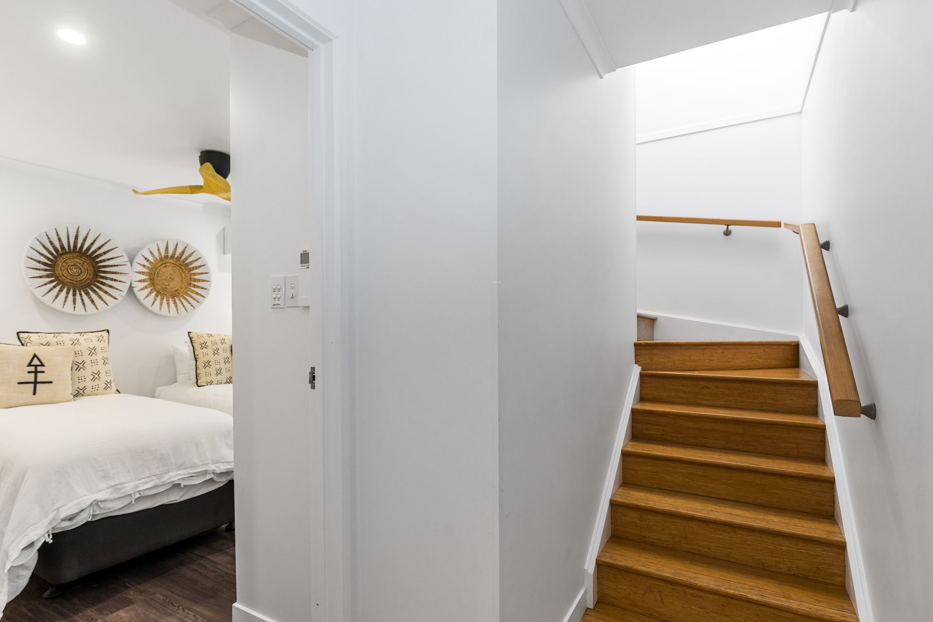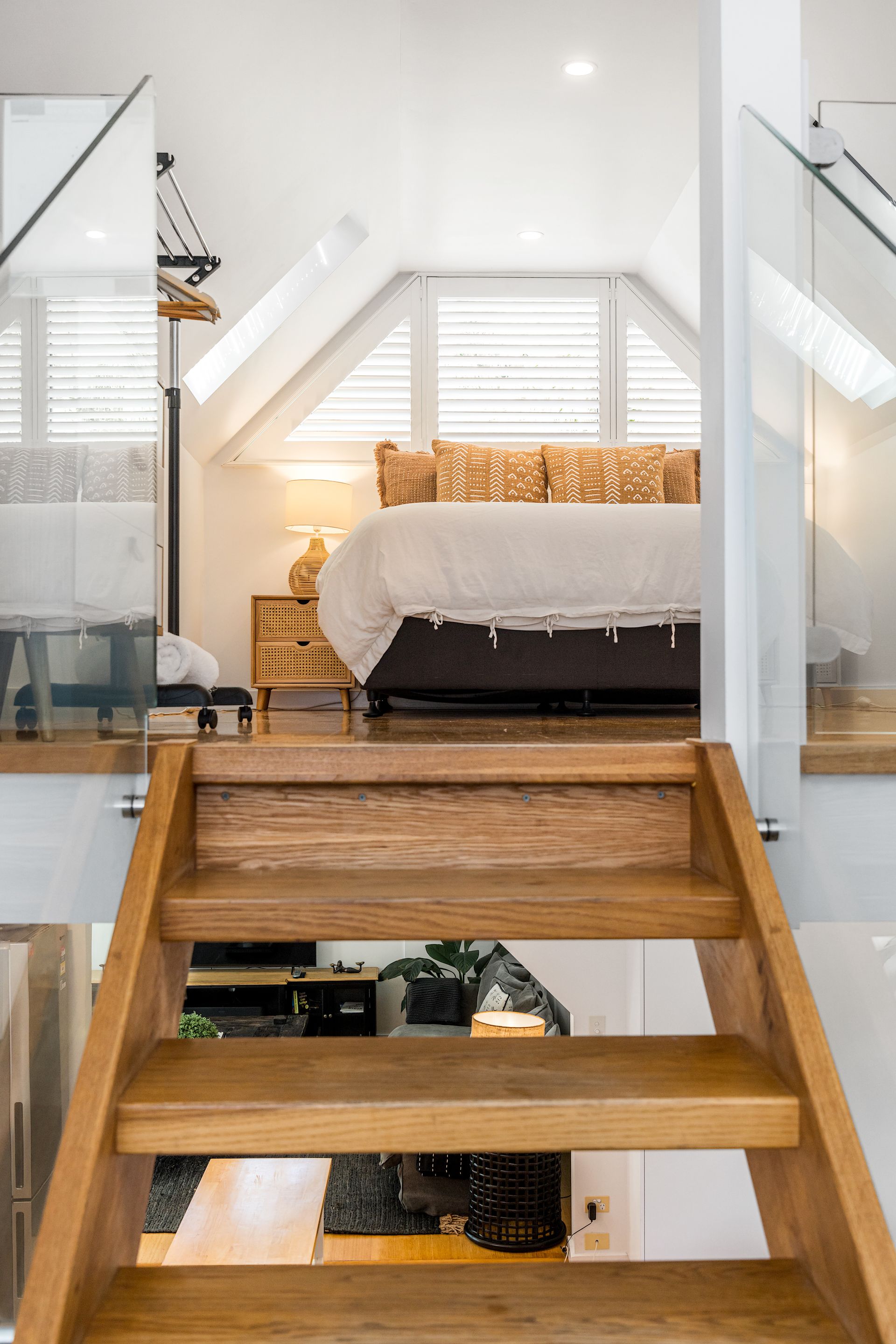 An artisan-built, exposed timber staircase leads to the gorgeous master suite – a light-filled, attic-style mezzanine bedroom with sloping ceilings, abundant windows and luxurious furnishings. The master features vintage reclaimed furniture, a Smart TV and reverse-cycle air conditioning. Downstairs, three additional bedrooms open onto private courtyard spaces.