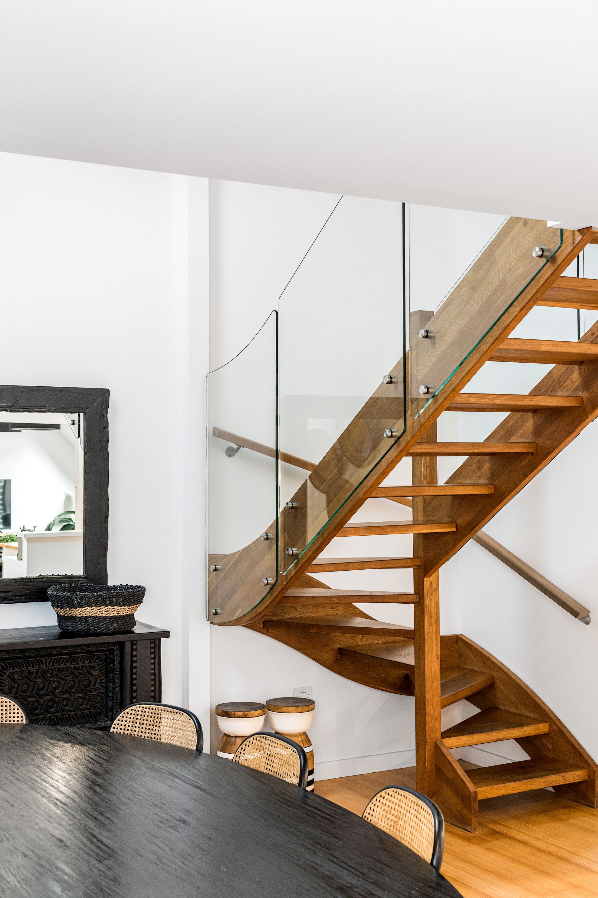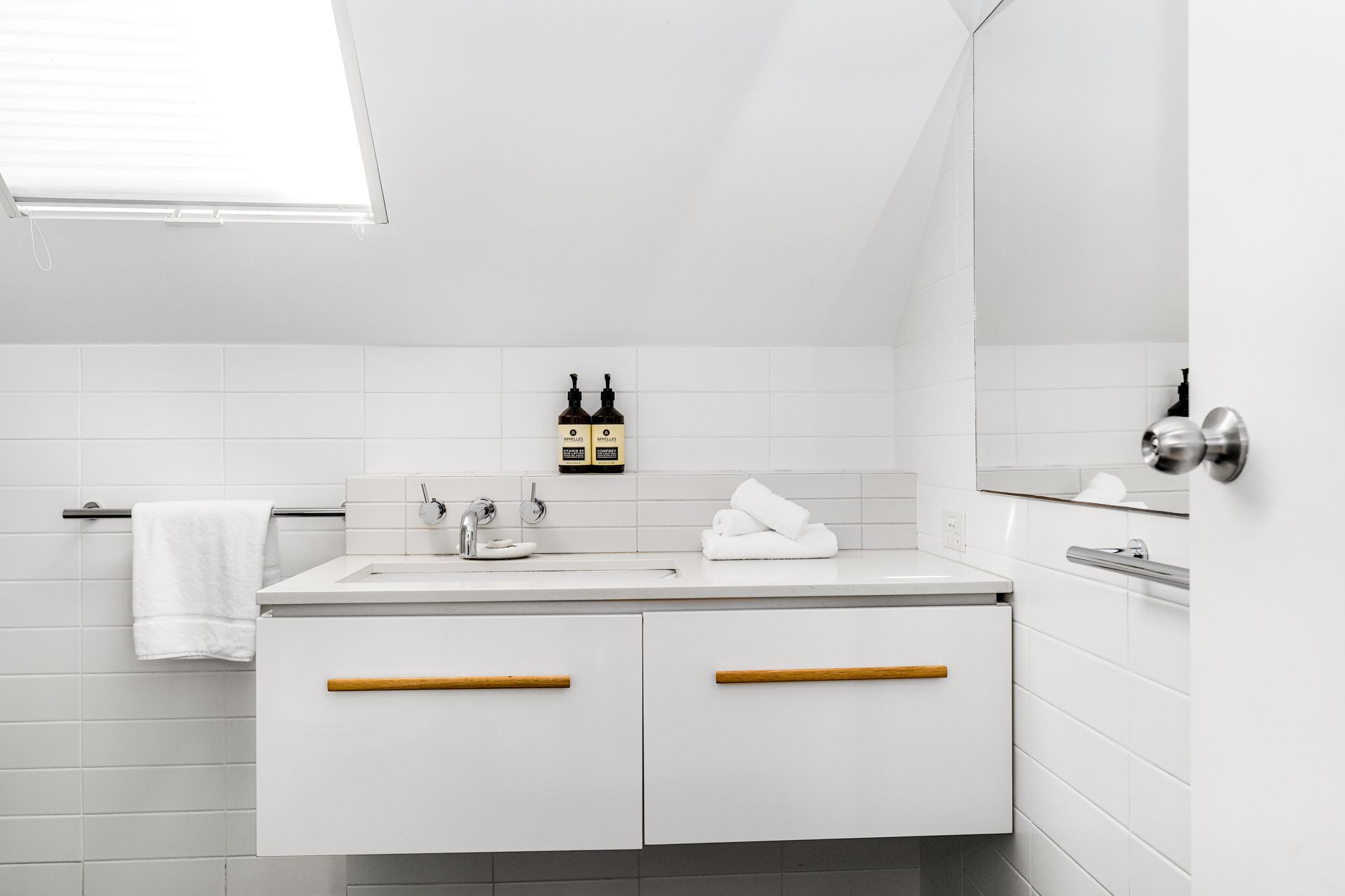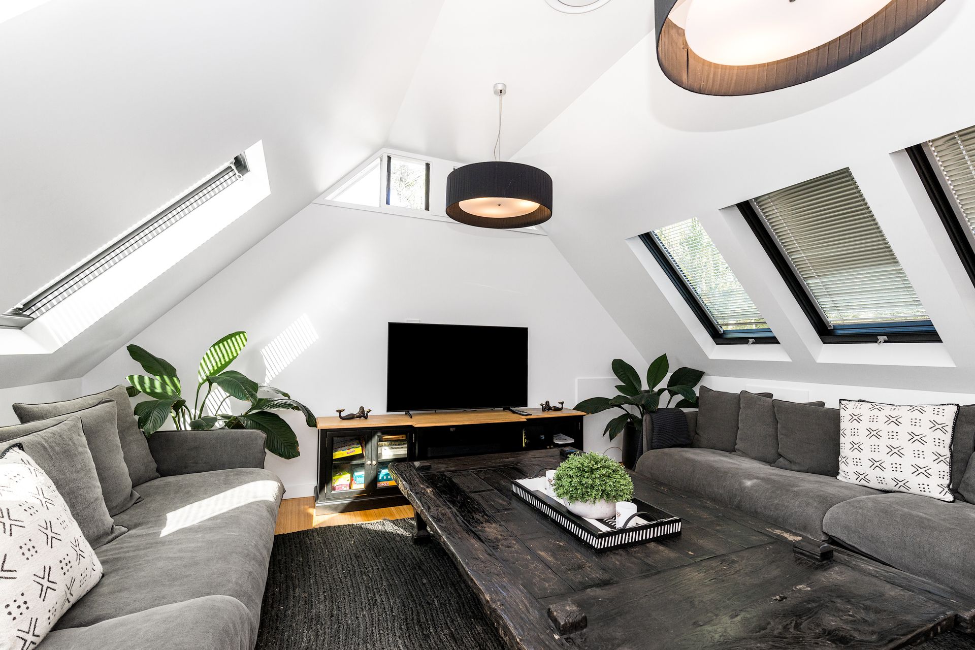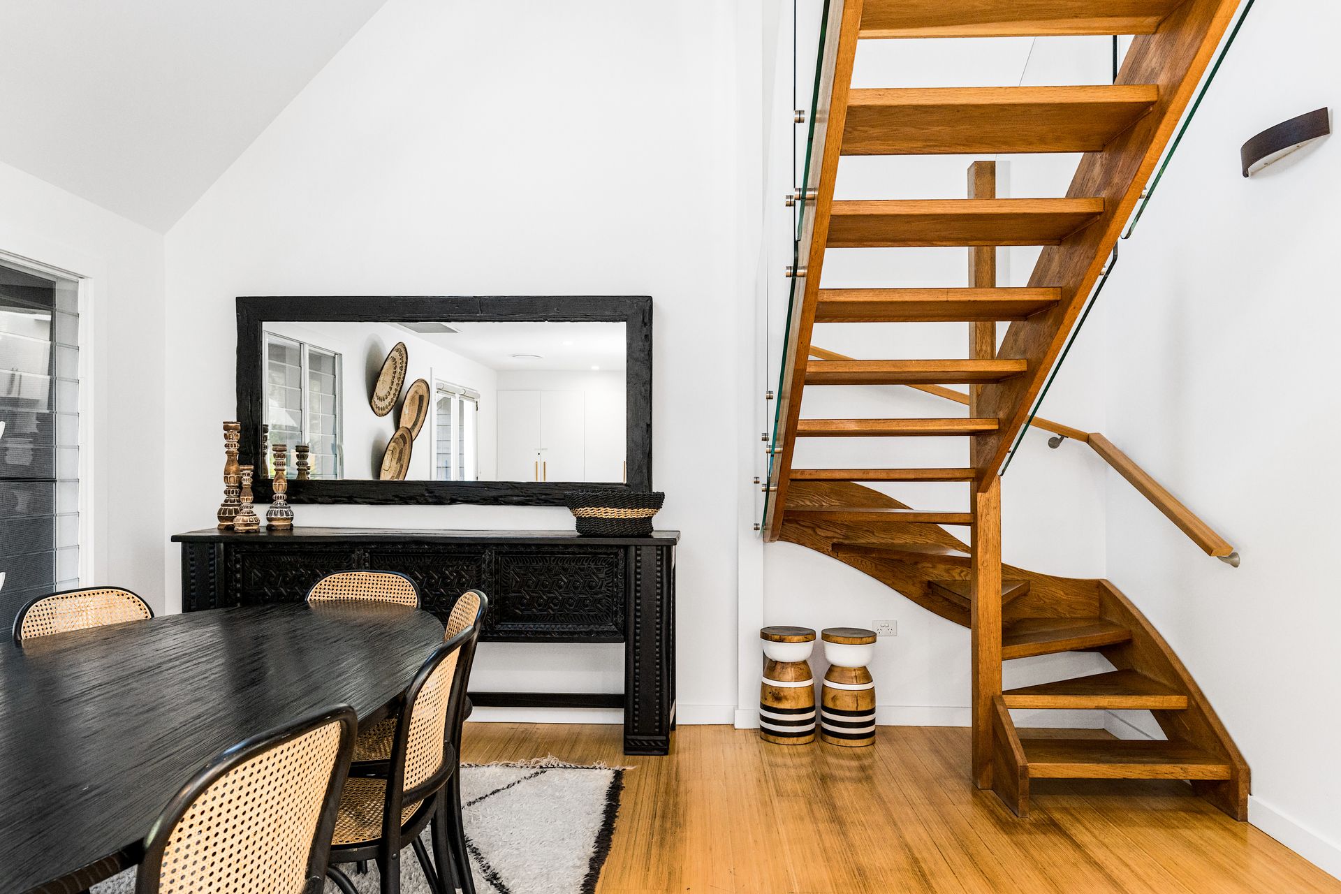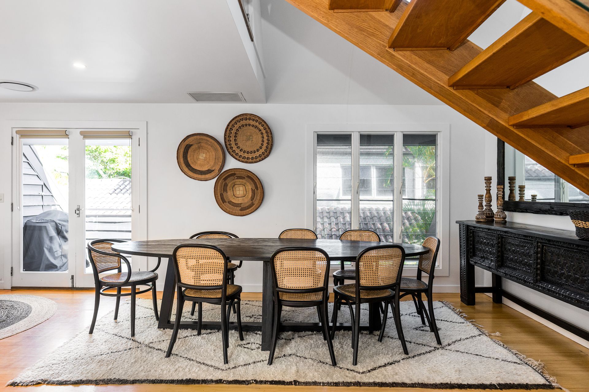 An artisan-built, exposed timber staircase leads to the gorgeous master suite – a light-filled, attic-style mezzanine bedroom with sloping ceilings, abundant windows and luxurious furnishings. The master features vintage reclaimed furniture, a Smart TV and reverse-cycle air conditioning. Downstairs, three additional bedrooms open onto private courtyard spaces.