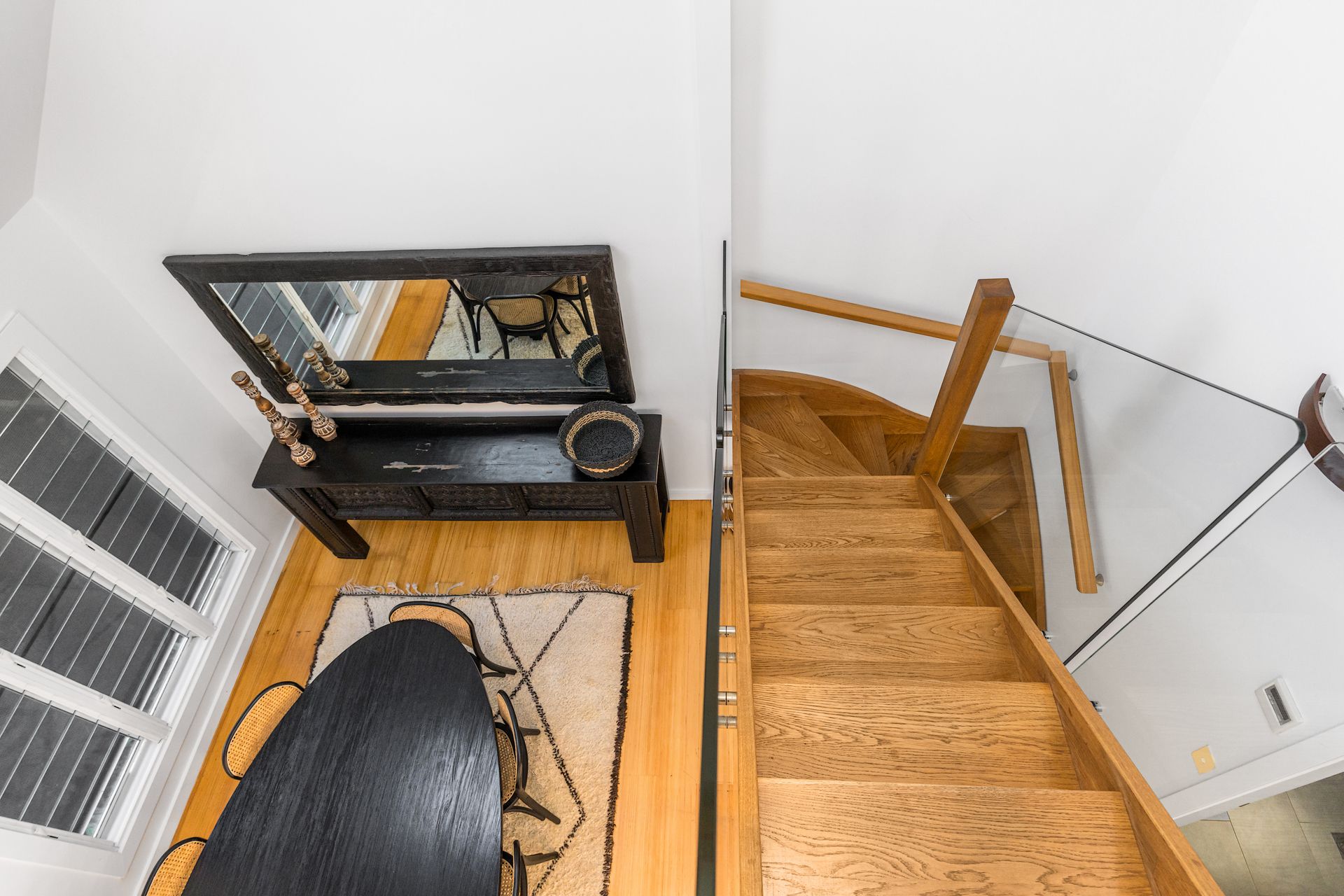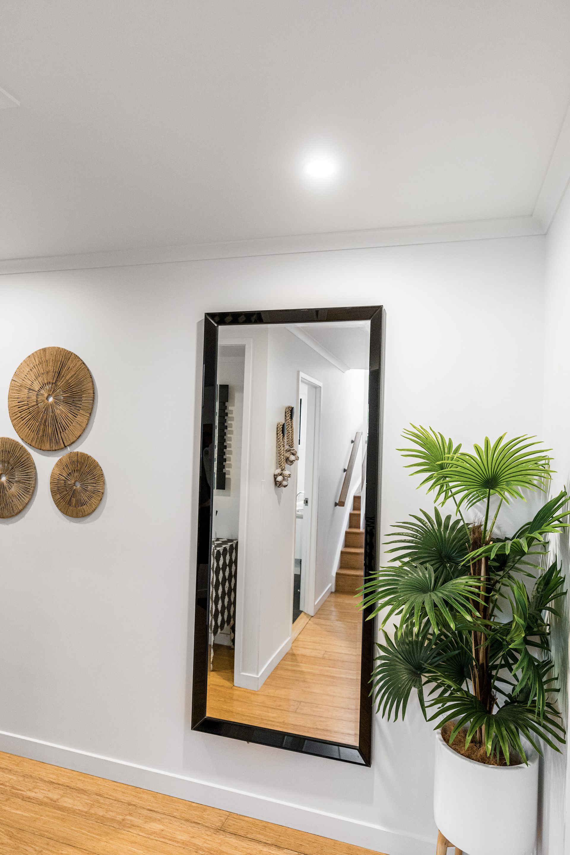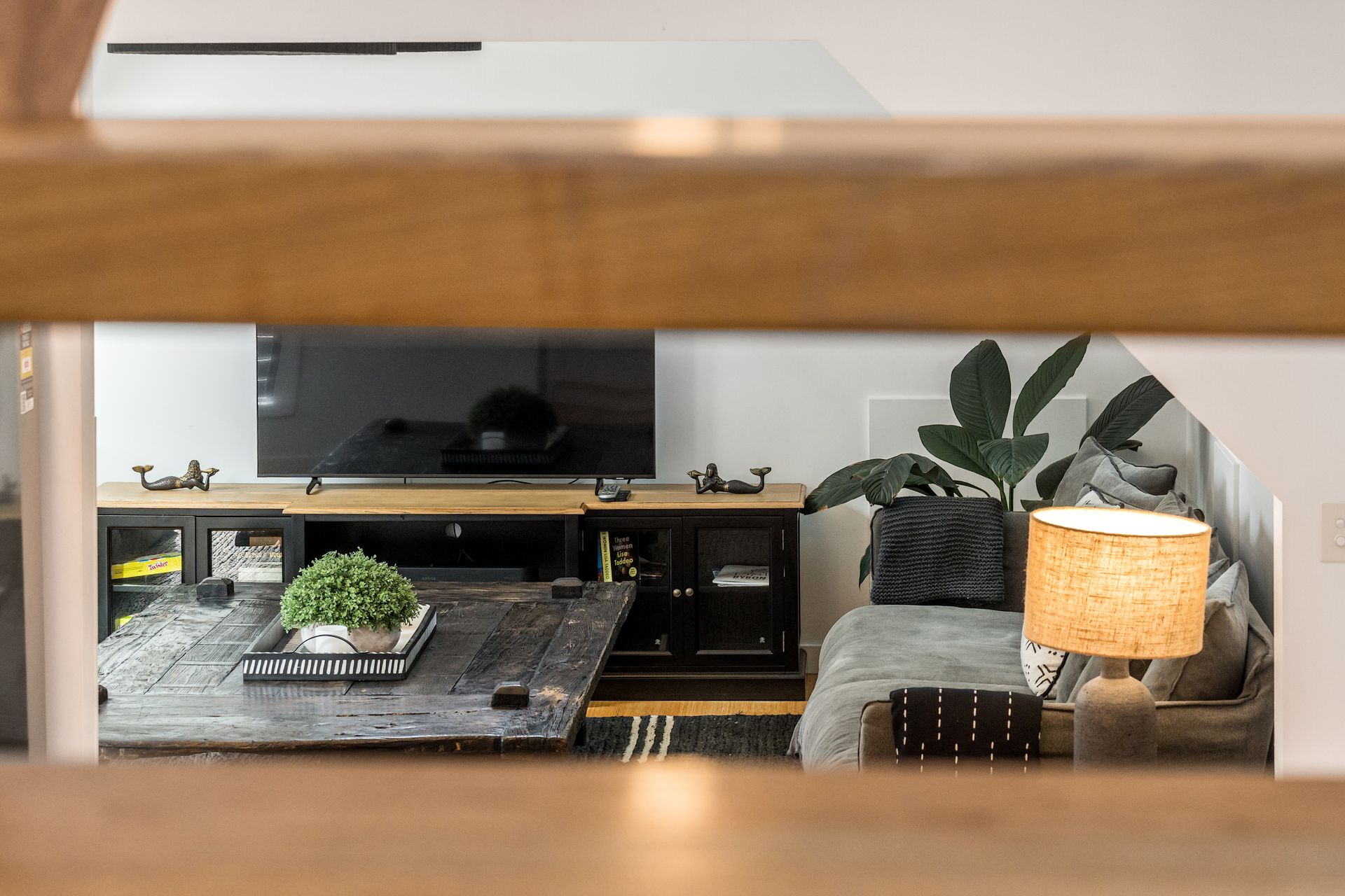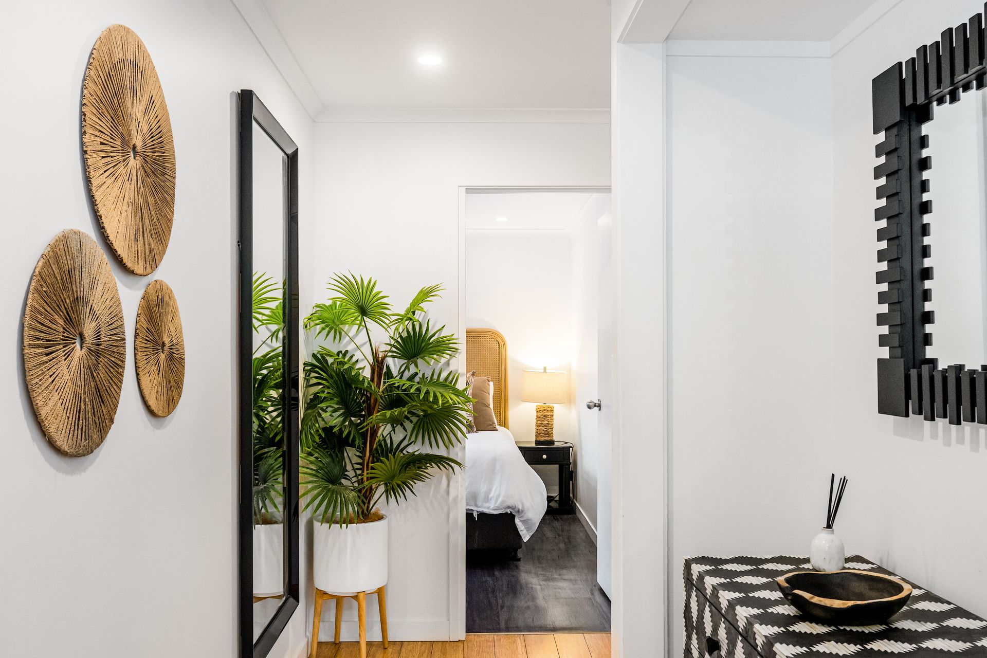 An artisan-built, exposed timber staircase leads to the gorgeous master suite – a light-filled, attic-style mezzanine bedroom with sloping ceilings, abundant windows and luxurious furnishings. The master features vintage reclaimed furniture, a Smart TV and reverse-cycle air conditioning. Downstairs, three additional bedrooms open onto private courtyard spaces.