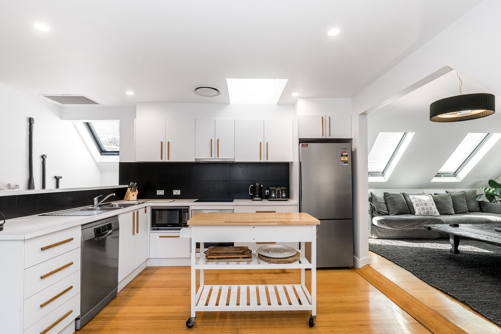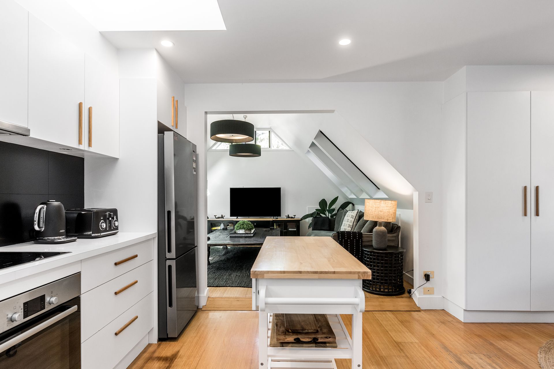 The open-plan kitchen and dining space transitions through an alcove-style doorway into a cosy, separate living area. Featuring sloping ceilings with generous windows that flood the space with natural light, the living room showcases two stylish lounges, timber tables and cabinets, reverse-cycle air conditioning and a Smart TV. Perfect for afternoon naps in the sunshine or relaxing with entertainment after a day of holiday adventures.