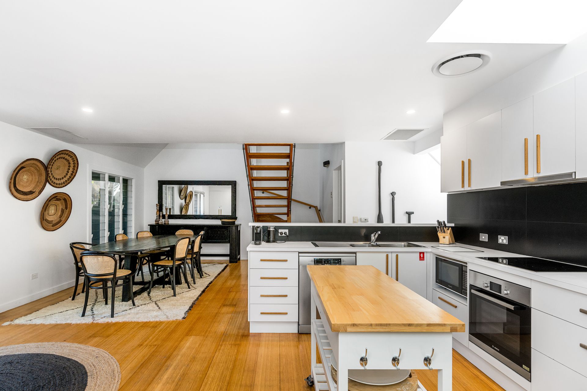 The sleek kitchen is light-filled and elegant, with clean lines, crisp white surfaces and quality stainless steel appliances. The open-plan area includes a dining space featuring a modern, Scandinavian-style whitewashed table with white and timber dining chairs. Glass timber-framed doors open from the kitchen and dining area onto a sun-drenched balcony.