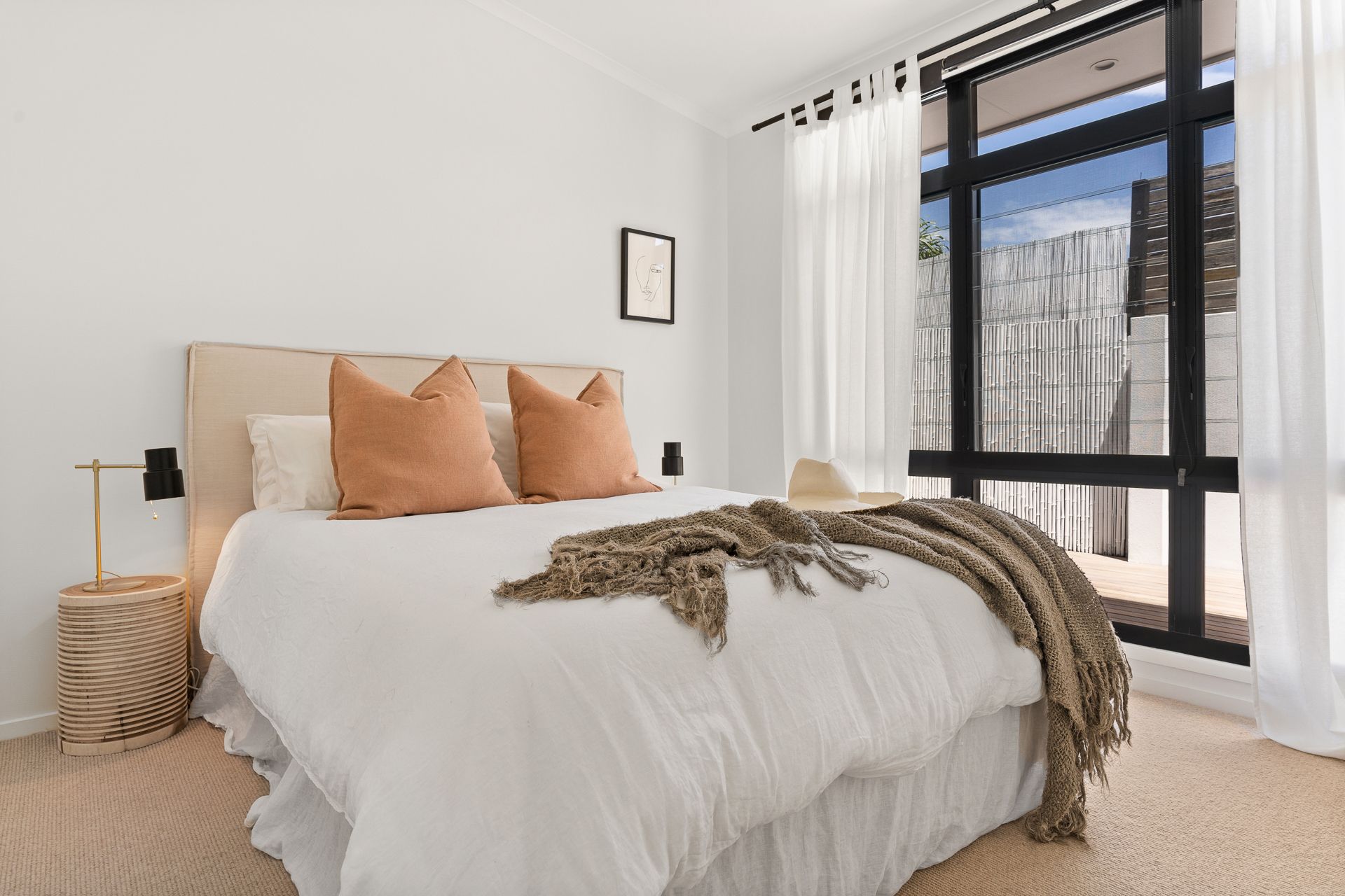 Bedroom 2: queen bed, ceiling fan and glass doors accessing the outdoor seating area, built-in robe
