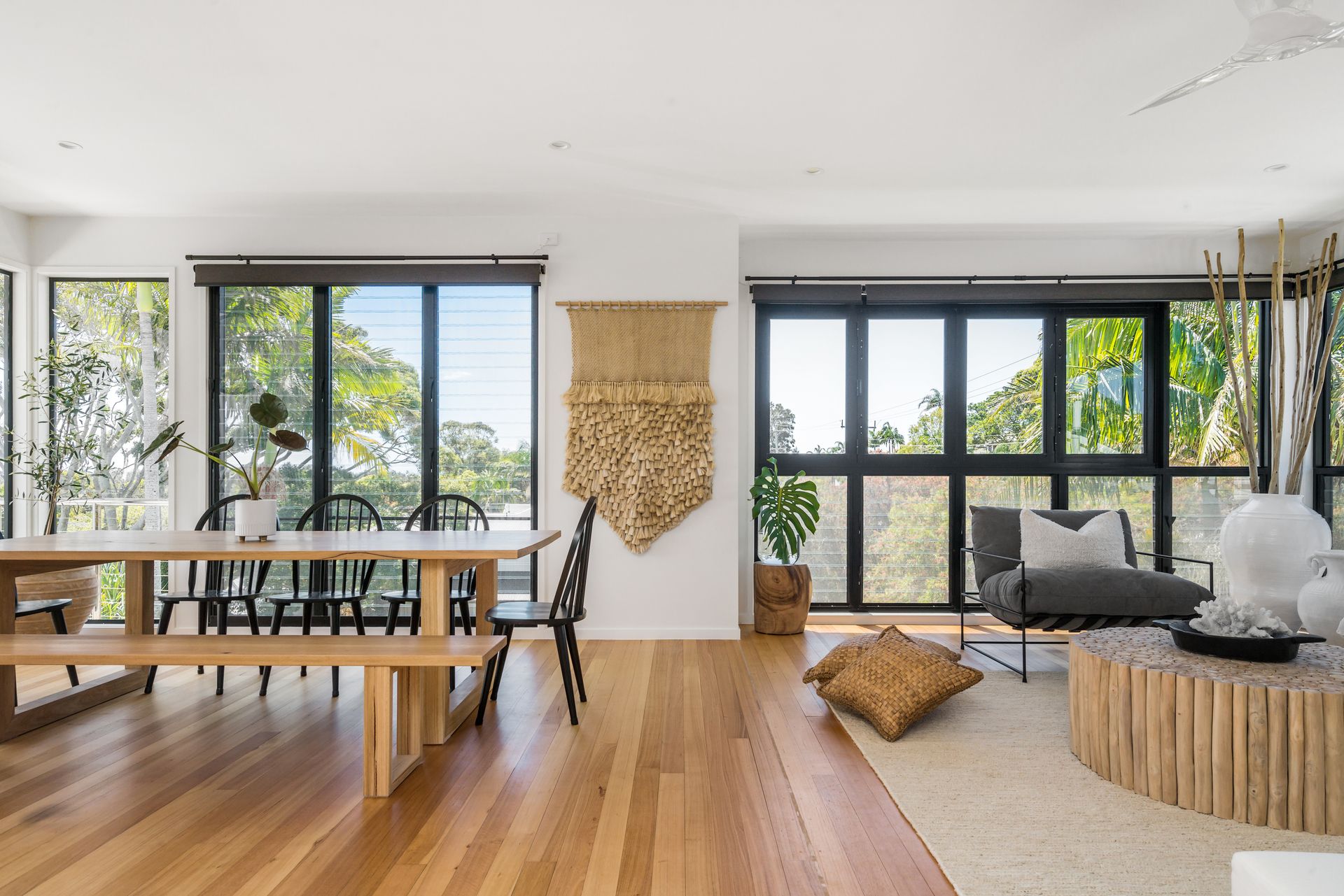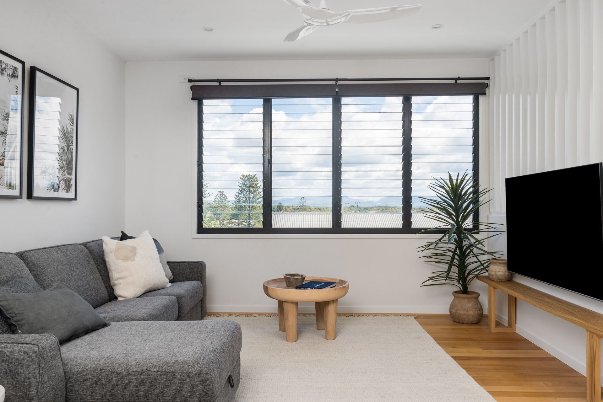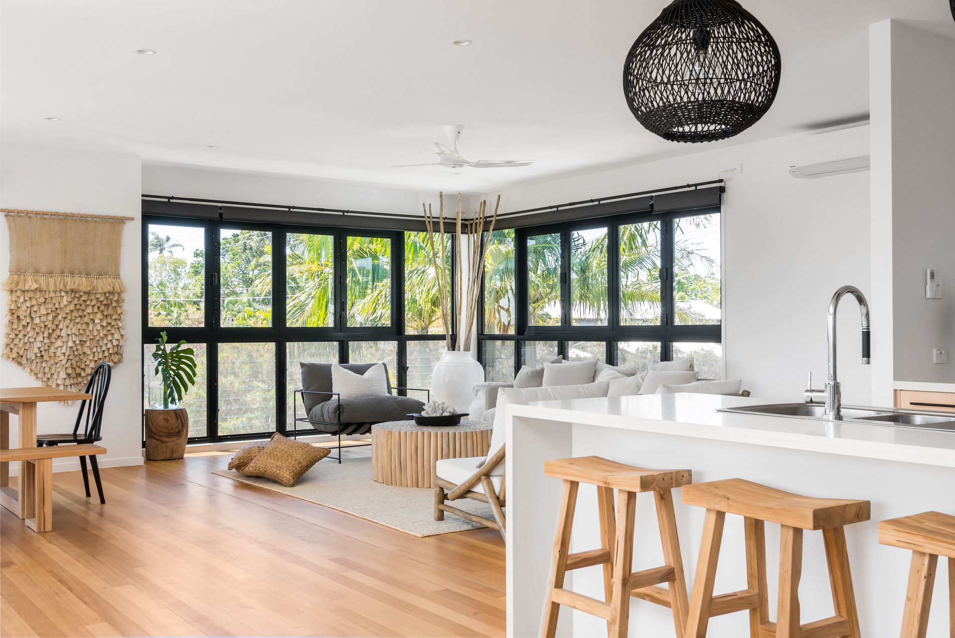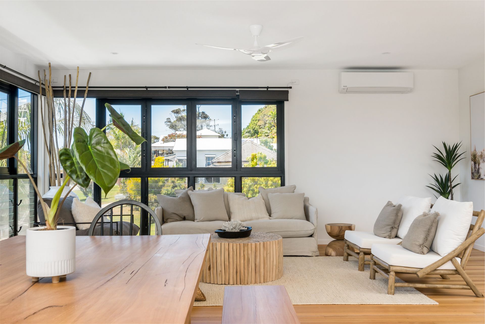 This freshly styled area captures natural light through floor-to-ceiling windows, offering sweeping views across Byron township to Mt Warning and the picturesque hinterland beyond. Glide across polished timber floors to designer rugs that cushion your feet as you relax on plush, comfortable seating. The space features reverse-cycle air conditioning for year-round comfort.