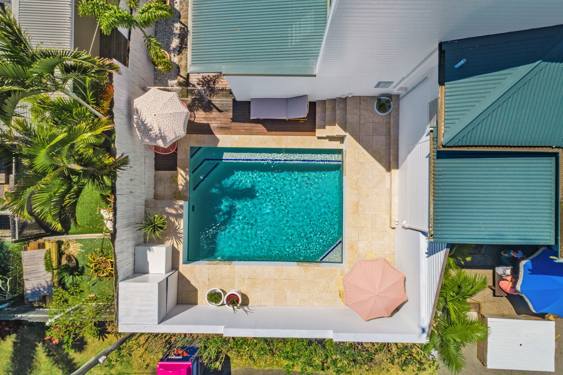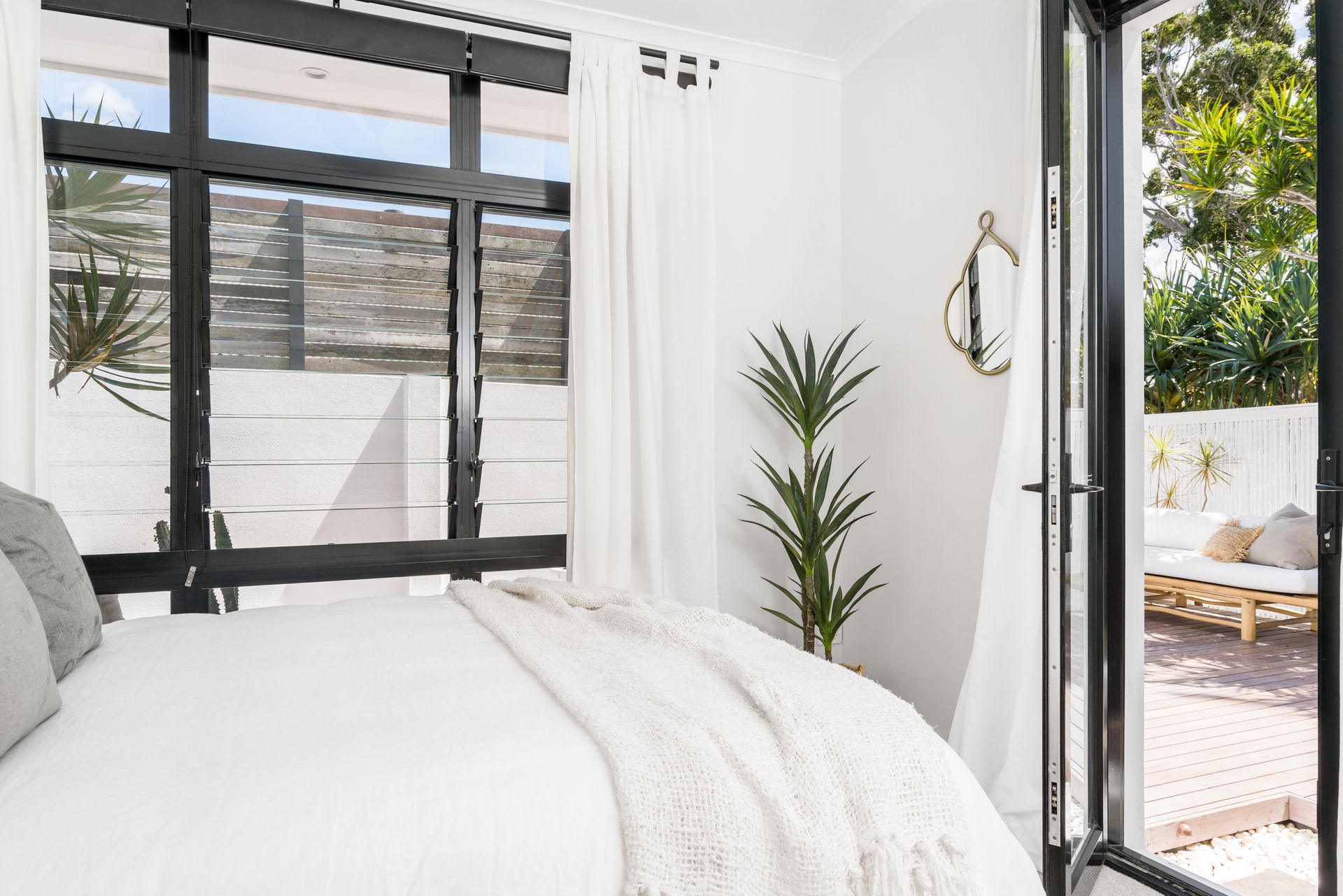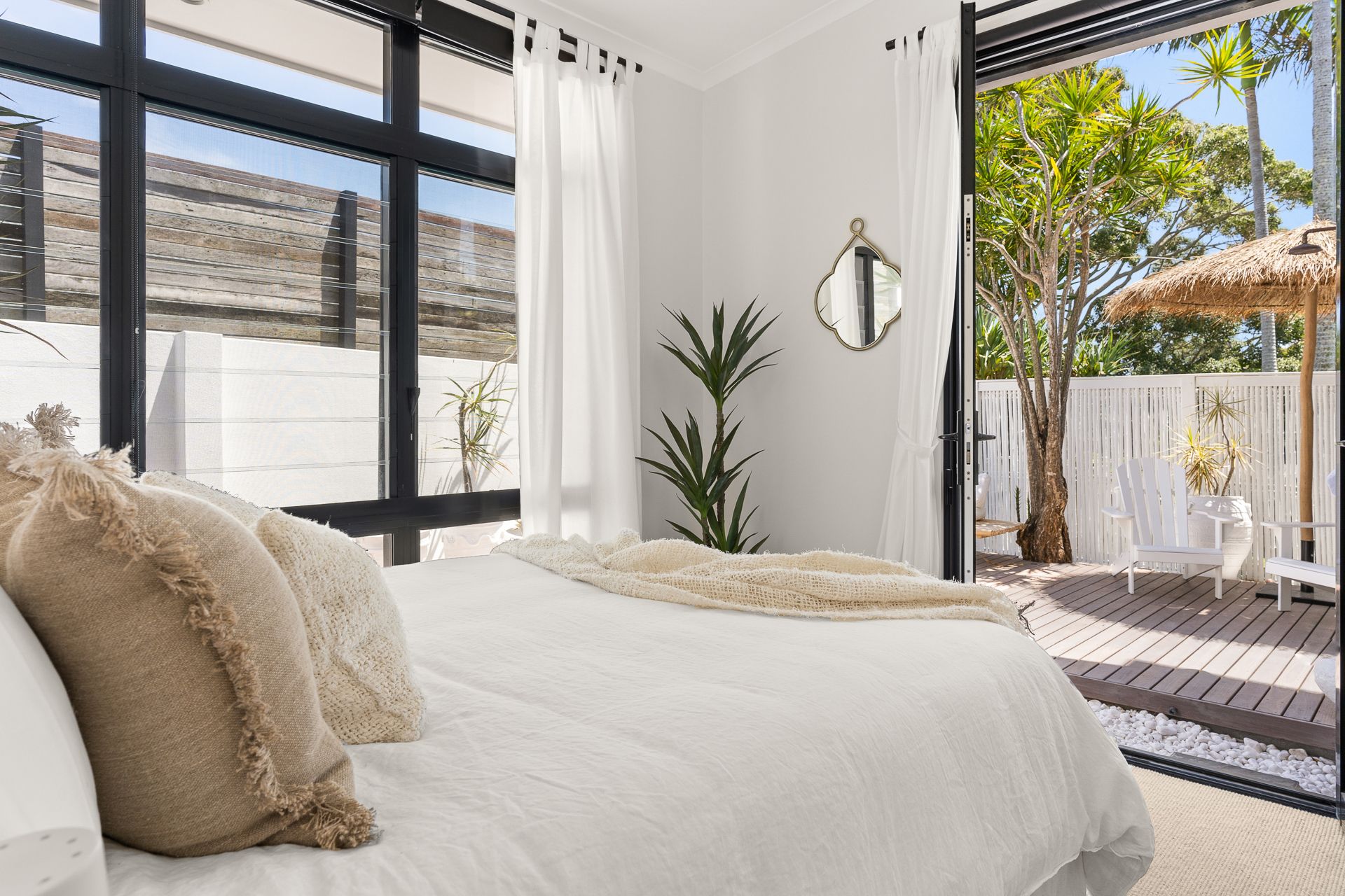 Soak up sunshine by the pool or enjoy tranquil moments on the downstairs deck and courtyard, complete with comfortable seating and cooling shade. This thoughtfully styled property balances luxury with comfort for the ultimate Byron Bay experience.