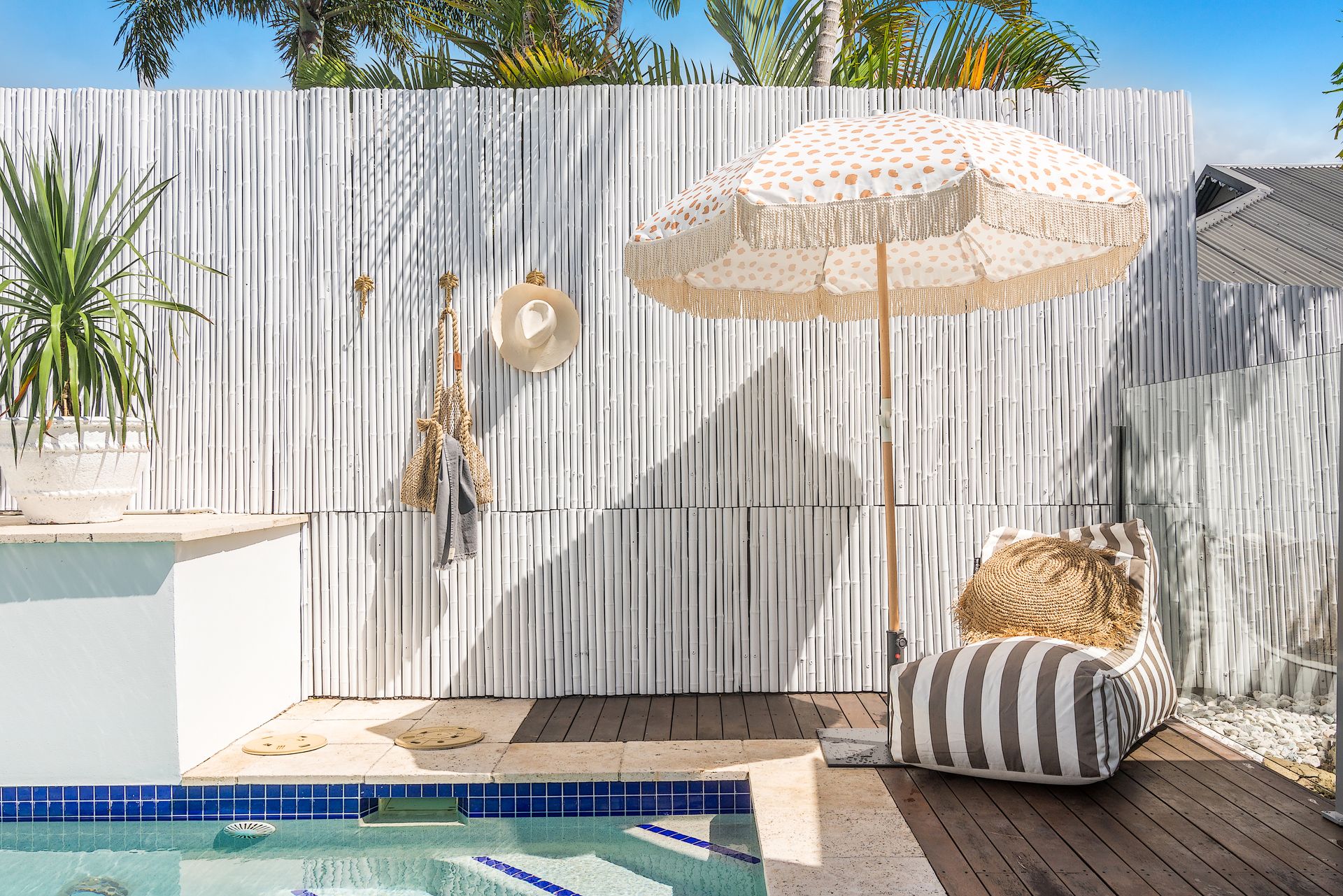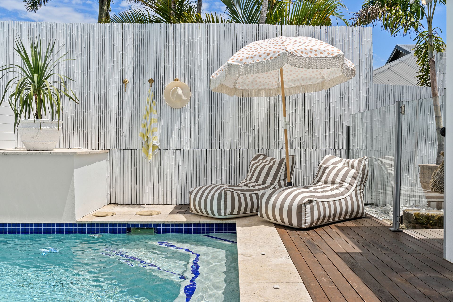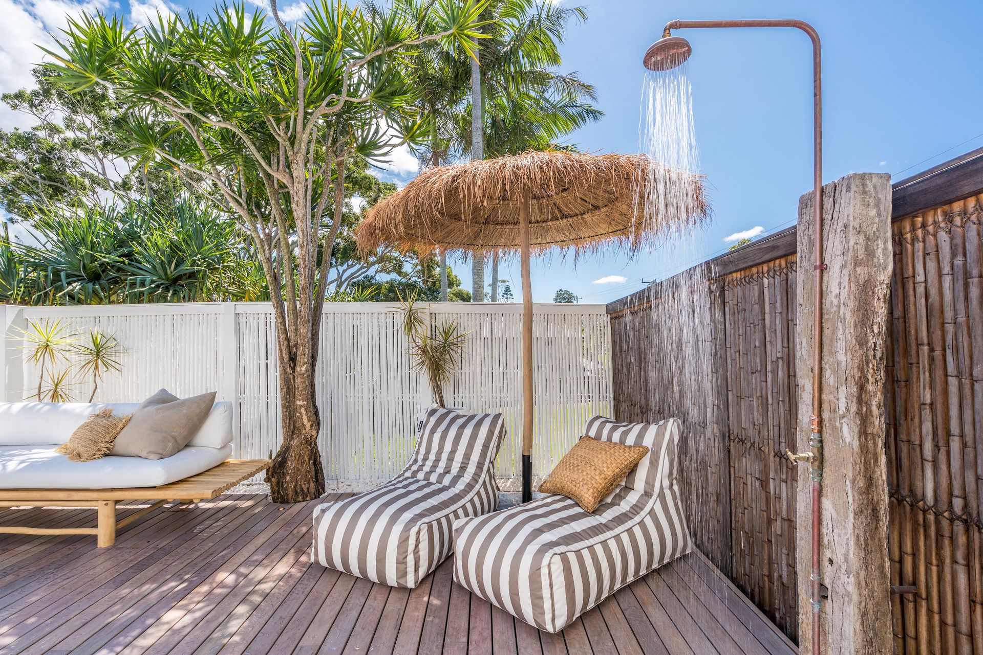 Don't miss the refreshing outdoor shower – ideally positioned near the entrance for rinsing off after beach adventures or poolside relaxation on sun-drenched days.