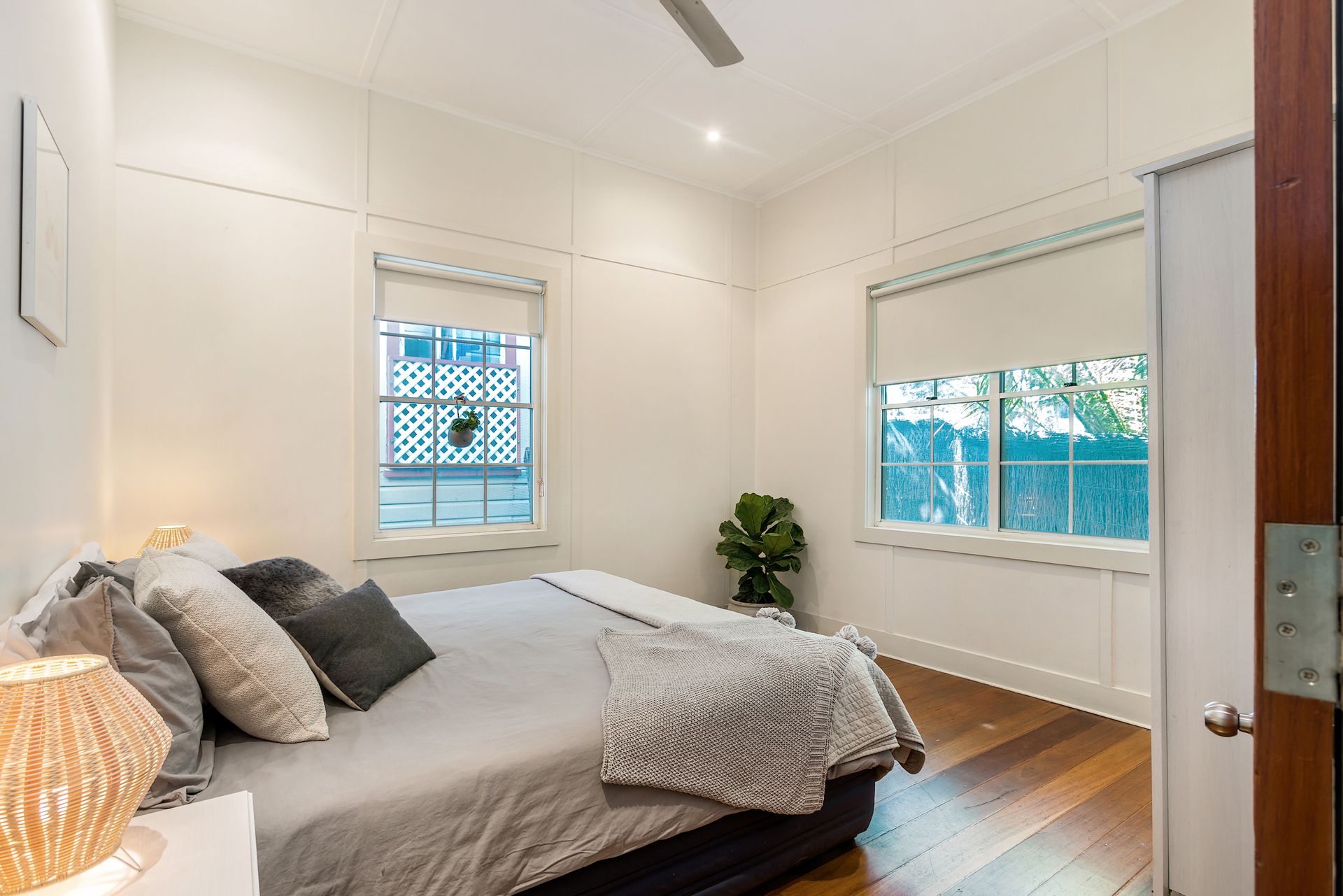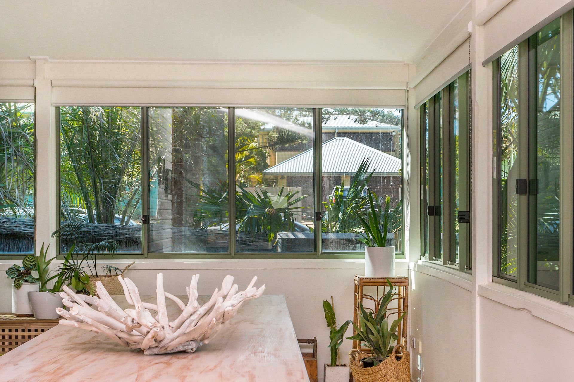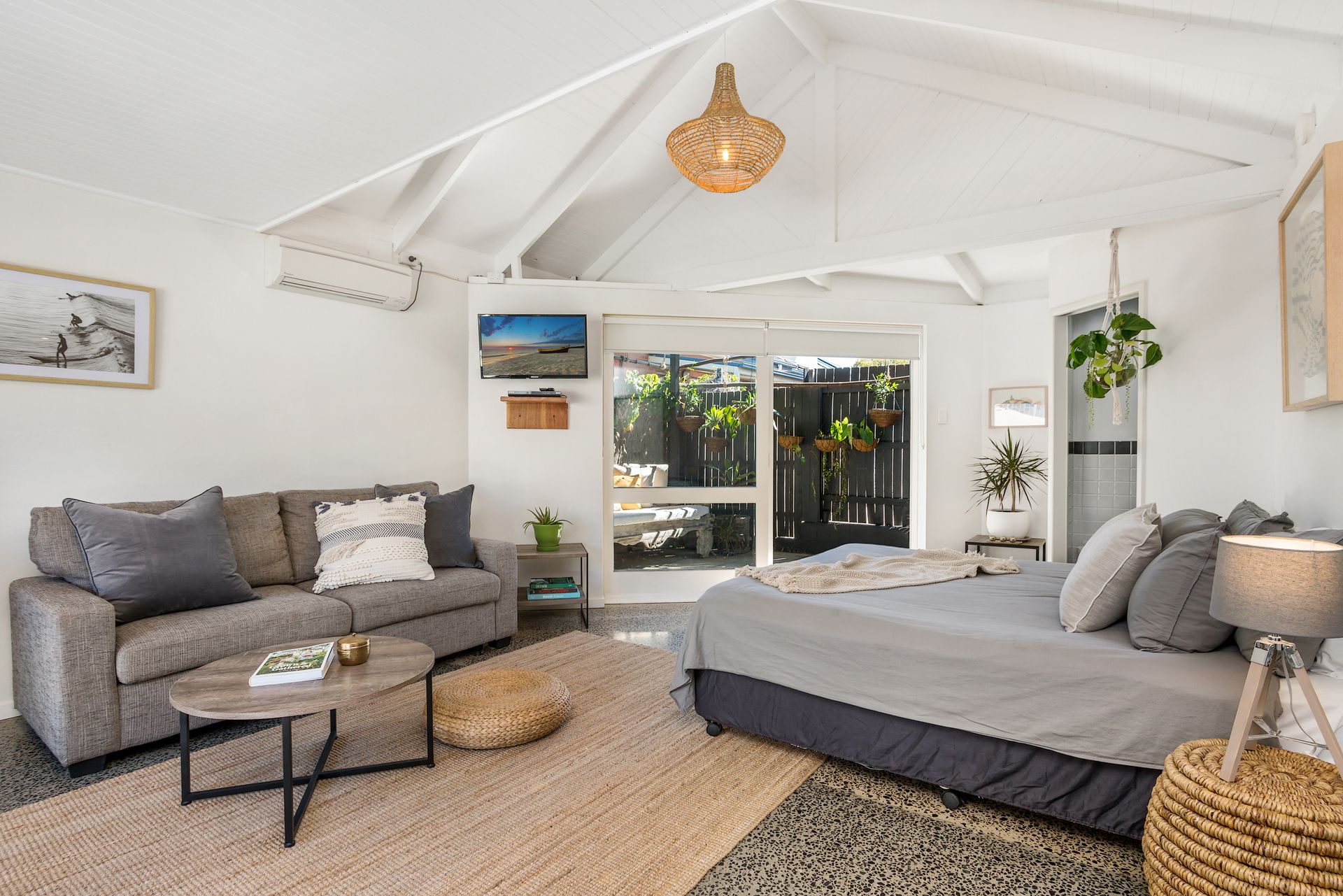 Spacious, simple, and full of personality, this relaxed retreat sleeps up to 11 guests across four bedrooms, three bathrooms, and a separate studio. You’ll find open living areas, soaring ceilings, sash windows, and an easygoing beach feel throughout — the perfect backdrop for a carefree Byron getaway.