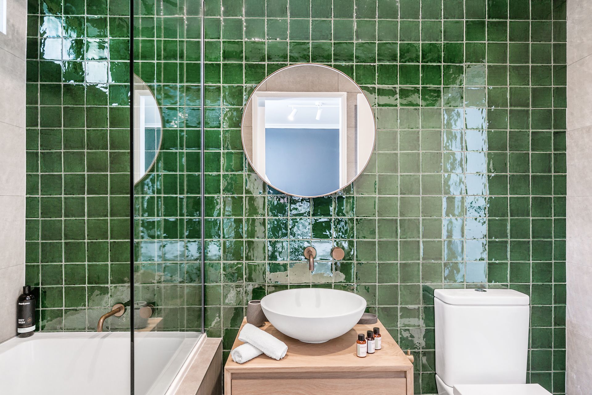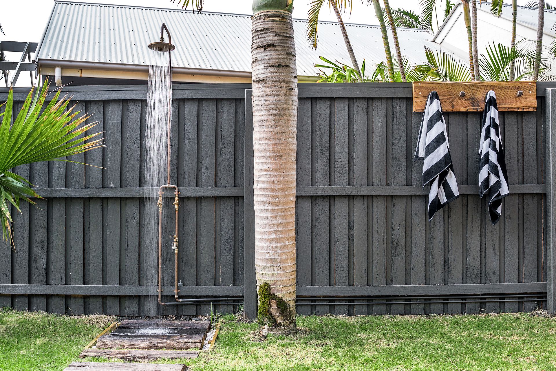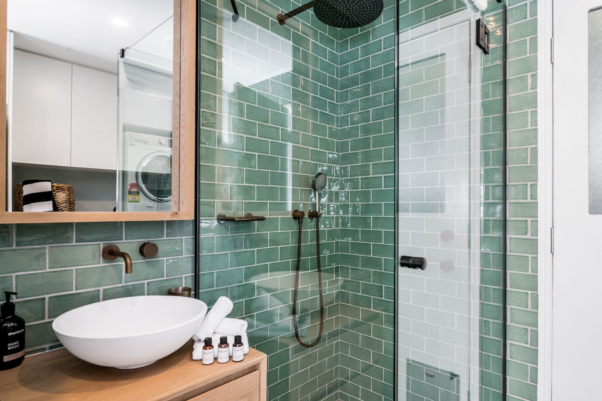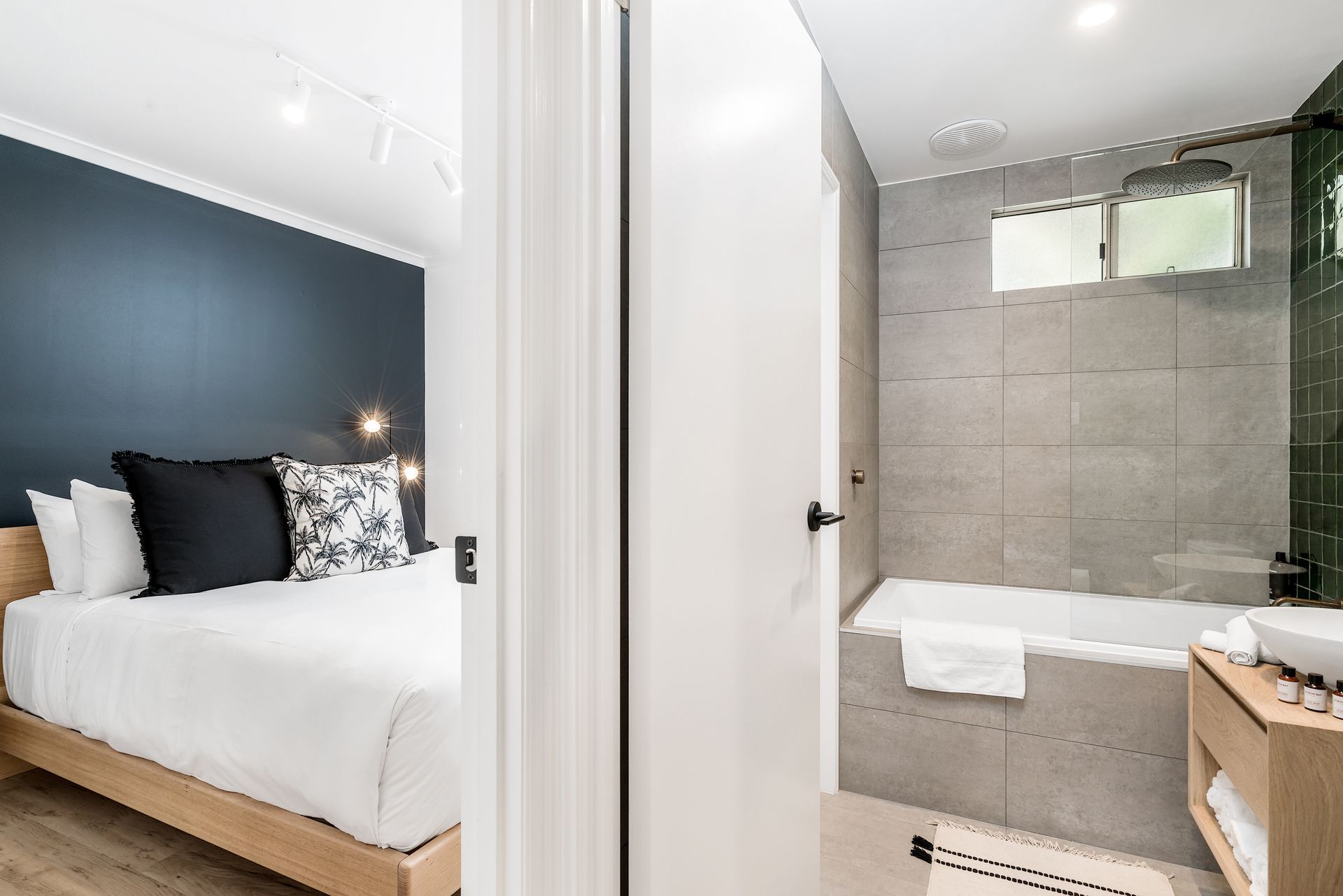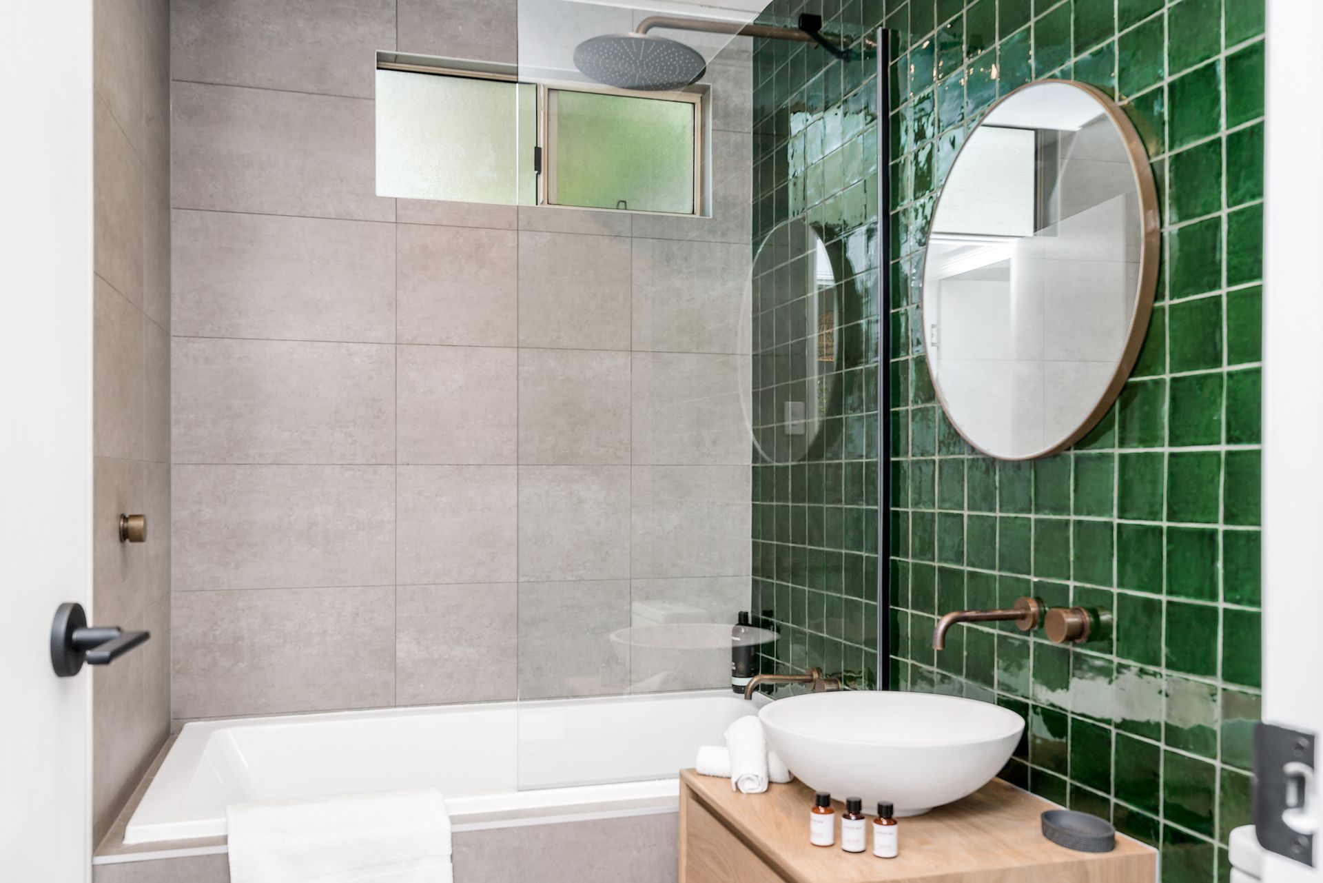 Two renovated and roomy bathrooms at 3 Salty Sisters feature modern subway tiling, floating timber cabinetry, rain showers and copper tapware. The main bathroom is shared with a fully functional laundry and includes access to outdoors. The second bathroom has shared access from the hallway and the master bedroom and has a shower/bath combination.