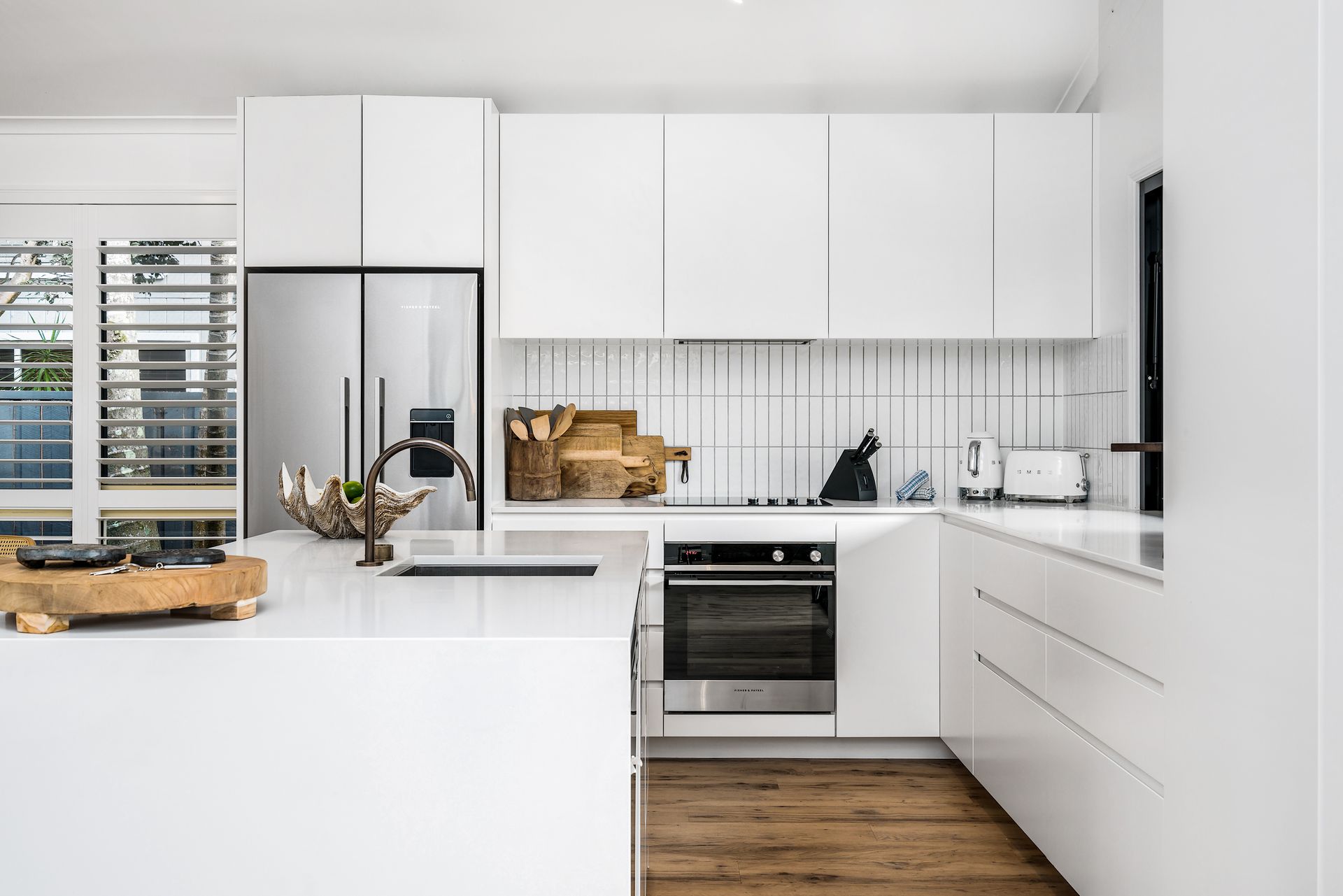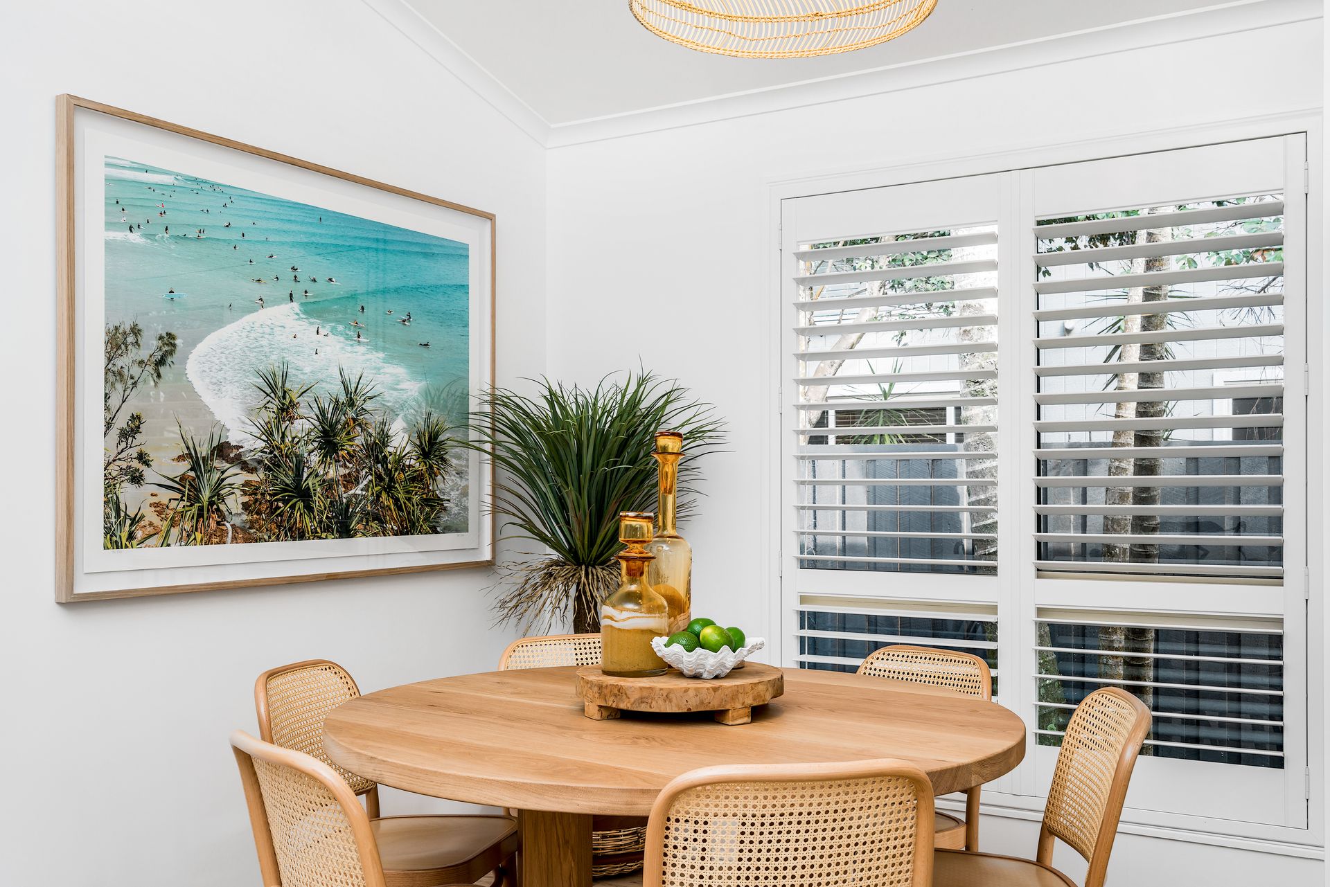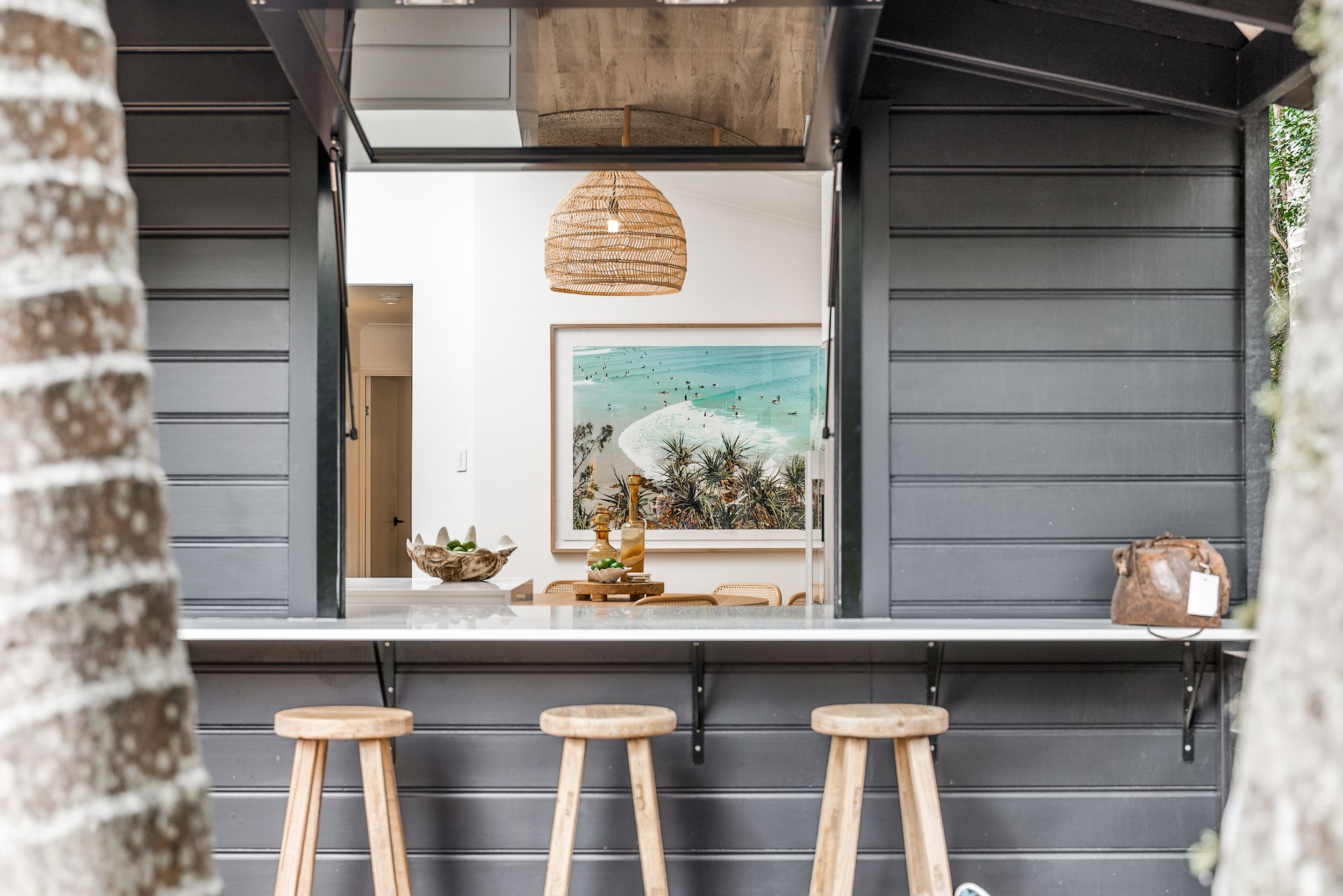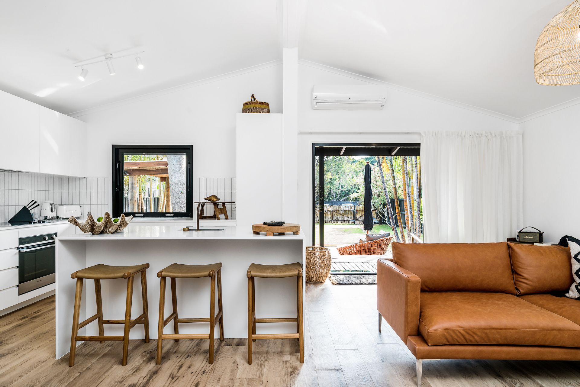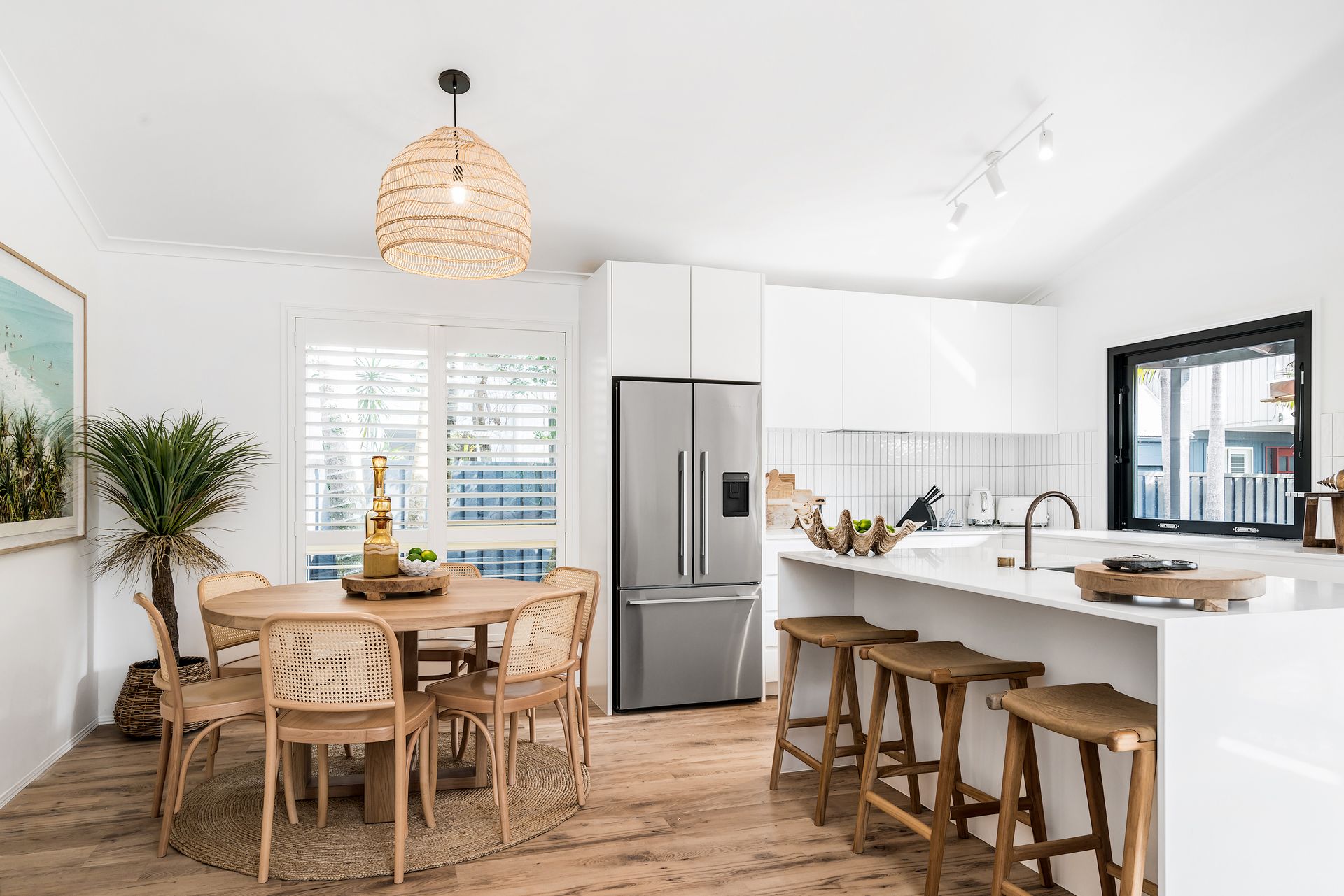 Inside, an open plan living, dining and cooking area showcases a modern, beach-luxe aesthetic.