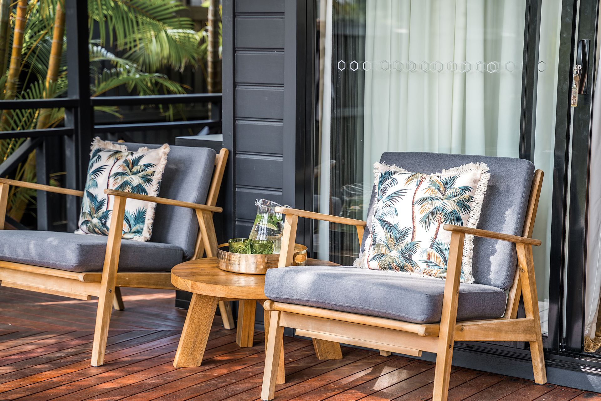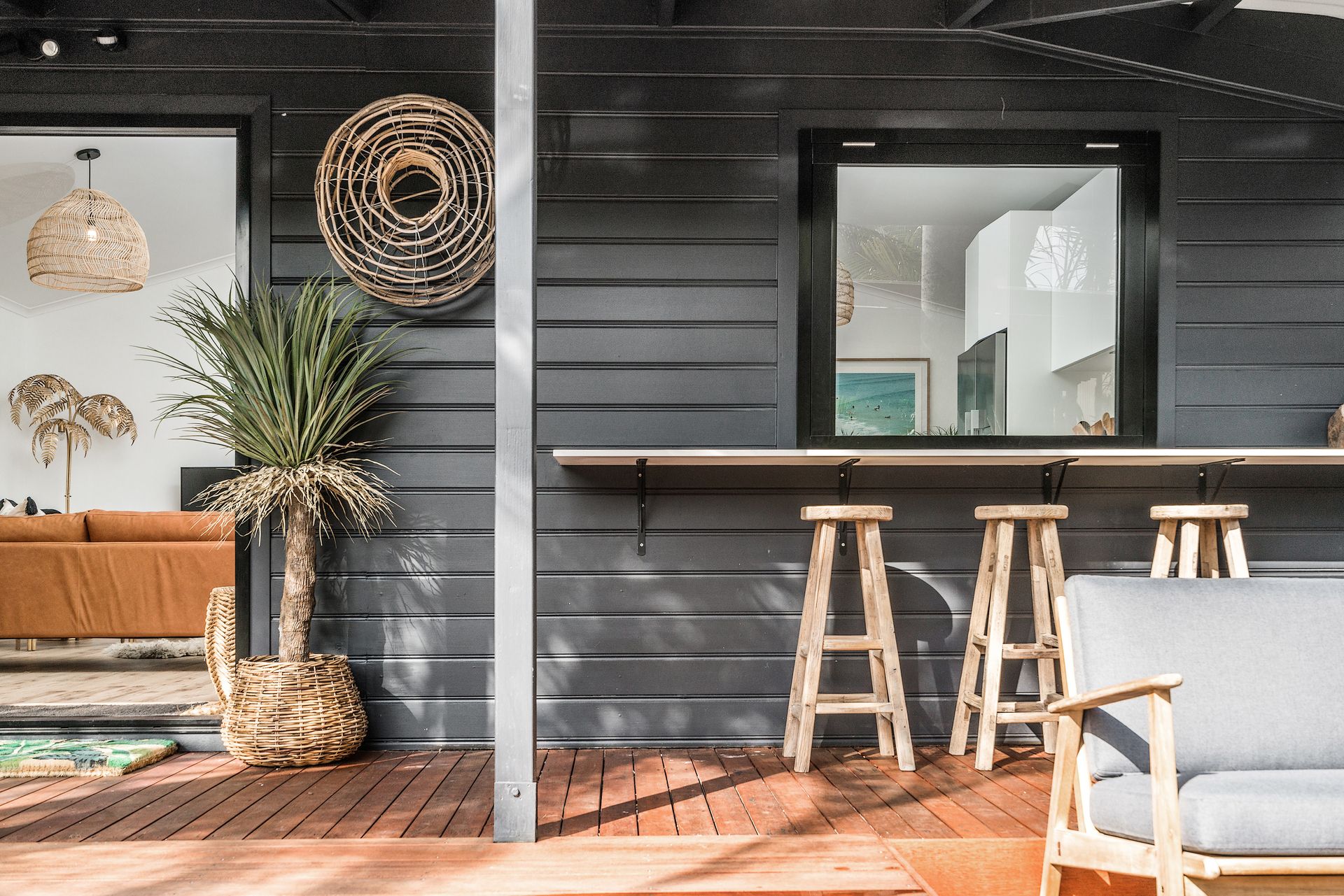 Wraparound timber deck with outdoor furniture, BBQ + servery window from kitchen