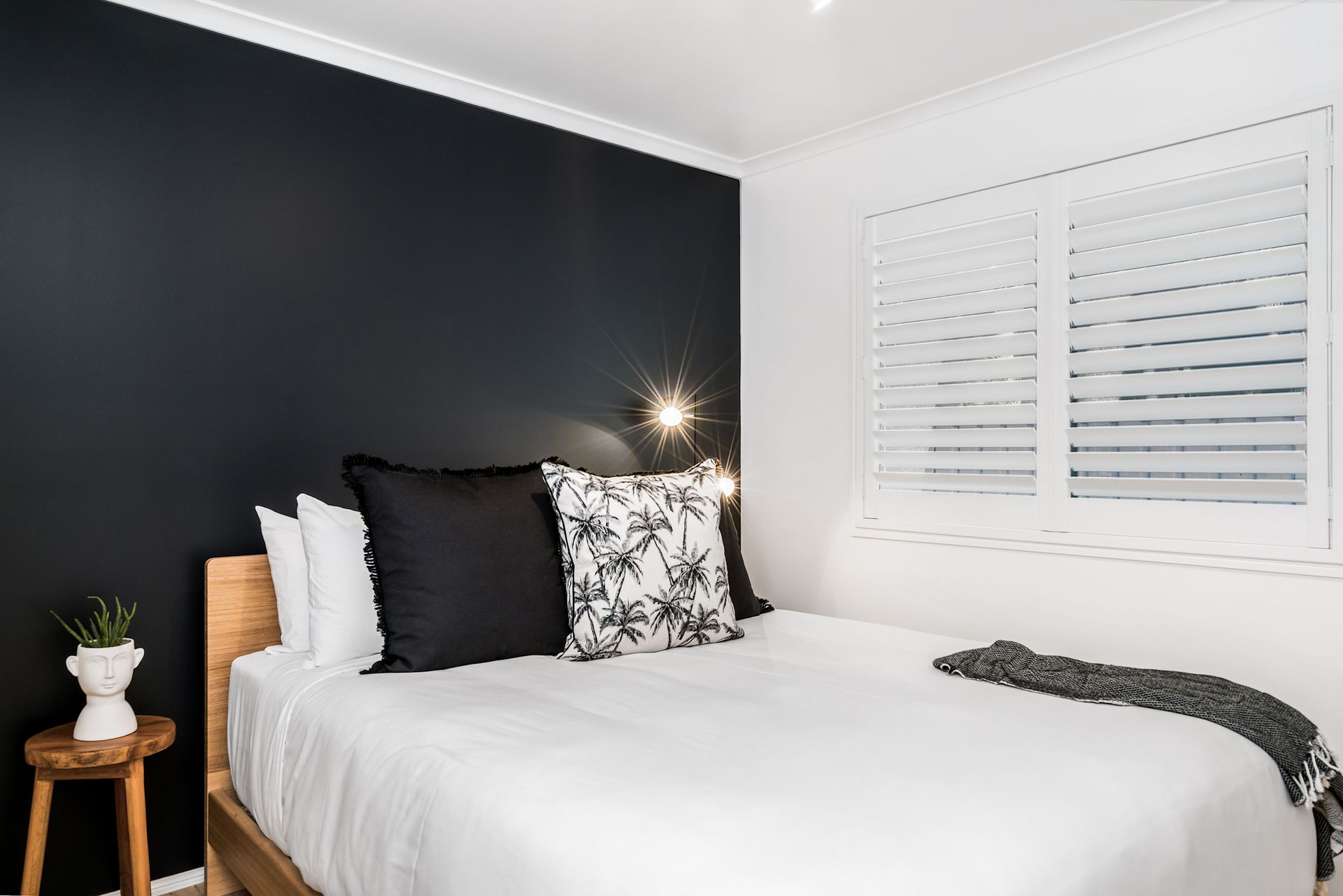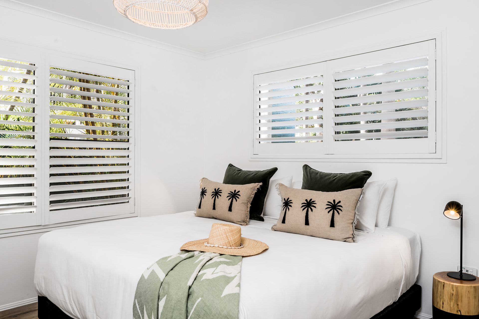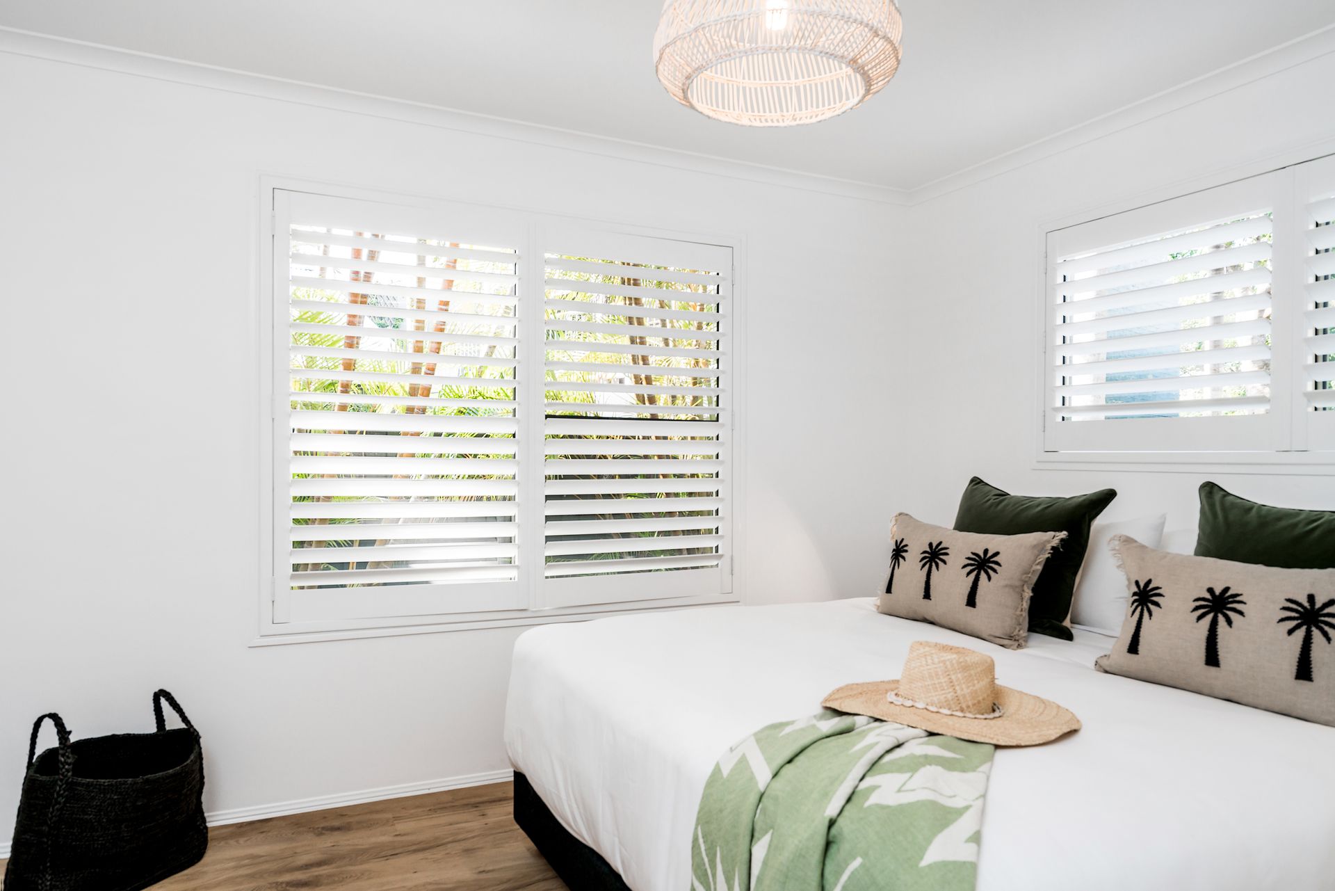 Simple, yet stylish, the bedrooms at 3 Salty Sisters capture that beachside aesthetic, with white plantation shutters and modern coastal interiors.