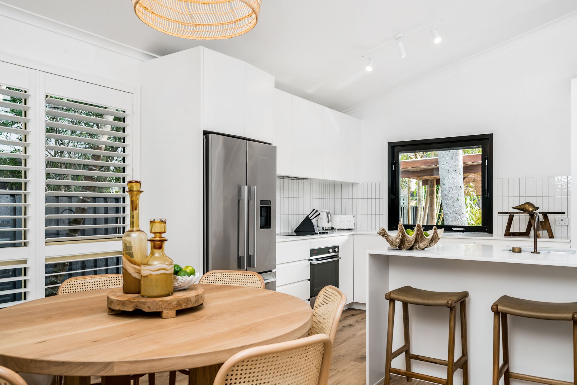 The open living and dining space at 3 Salty Sisters has been fitted with engineered timber floors, contemporary furnishings and modern styling. Relax on leather sofas or plush chairs in the living area, with the luxury of reverse cycle air con, complimentary wi-fi and a Smart TV (guests can sign into their own streaming service). Sliding glass doors offer dual access to the wraparound deck outside. Make meals in the luxe renovated kitchen with stone benchtops, double door stainless refrigerator and chat across the large island bench with leather/timber stools, then dine at the timber setting for 6. An awning window in the kitchen opens out servery-style to the alfresco area outside for an easy entertaining flow.