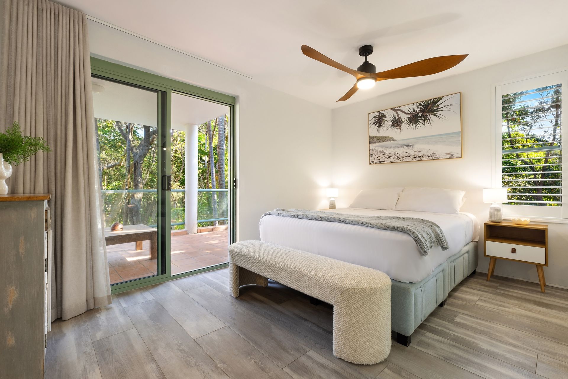 Light-filled and breezy, with warm timber floors and simple neutral interiors, the bedrooms at Apartment 3 Surfside are comfortable and welcoming. The master bedroom includes an ensuite and private outdoor space, with a queen bed, and 2 king singles available across the guest rooms.