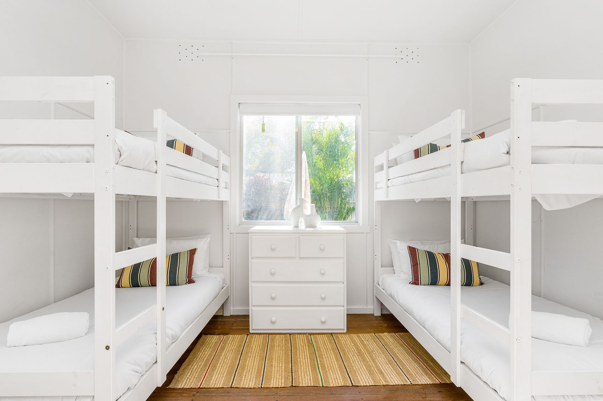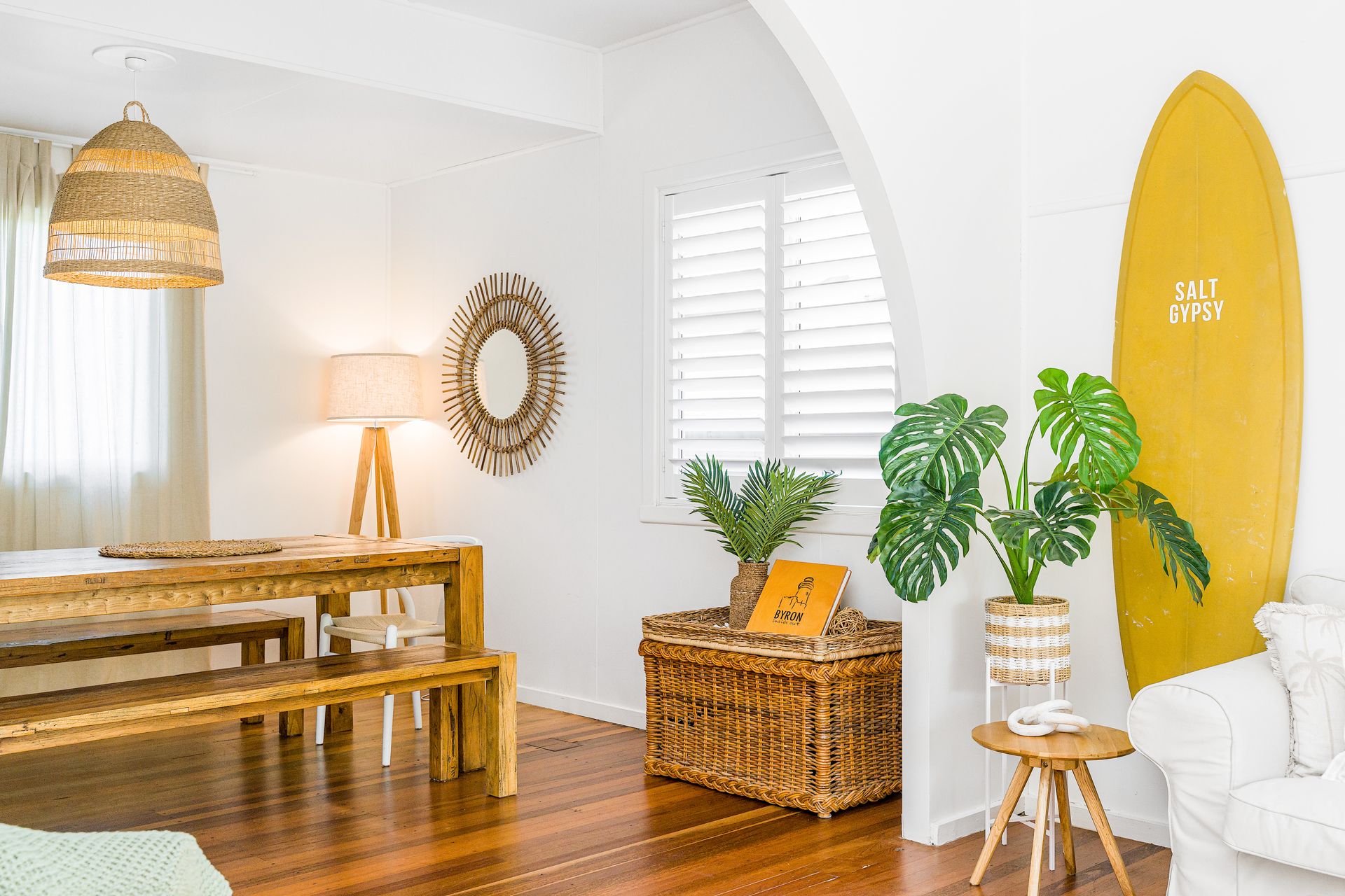 Perfectly located in Byron, Bungalow105 consists of 3 bedrooms – 2 Queen and a Bunk Room. Each bedroom is comfortably styled, bright and airy. There is plenty of space for adults and children with 2 separate living areas. The front living room with a TV and Foxtel opens to a dining area and has easy access to the outside deck area and the kitchen. The back rumpus area has a play area with a DVD and TV/Foxtel set up and there is easy access to outside from this room – perfect place for the kids to hang out after the beach. Wifi included.