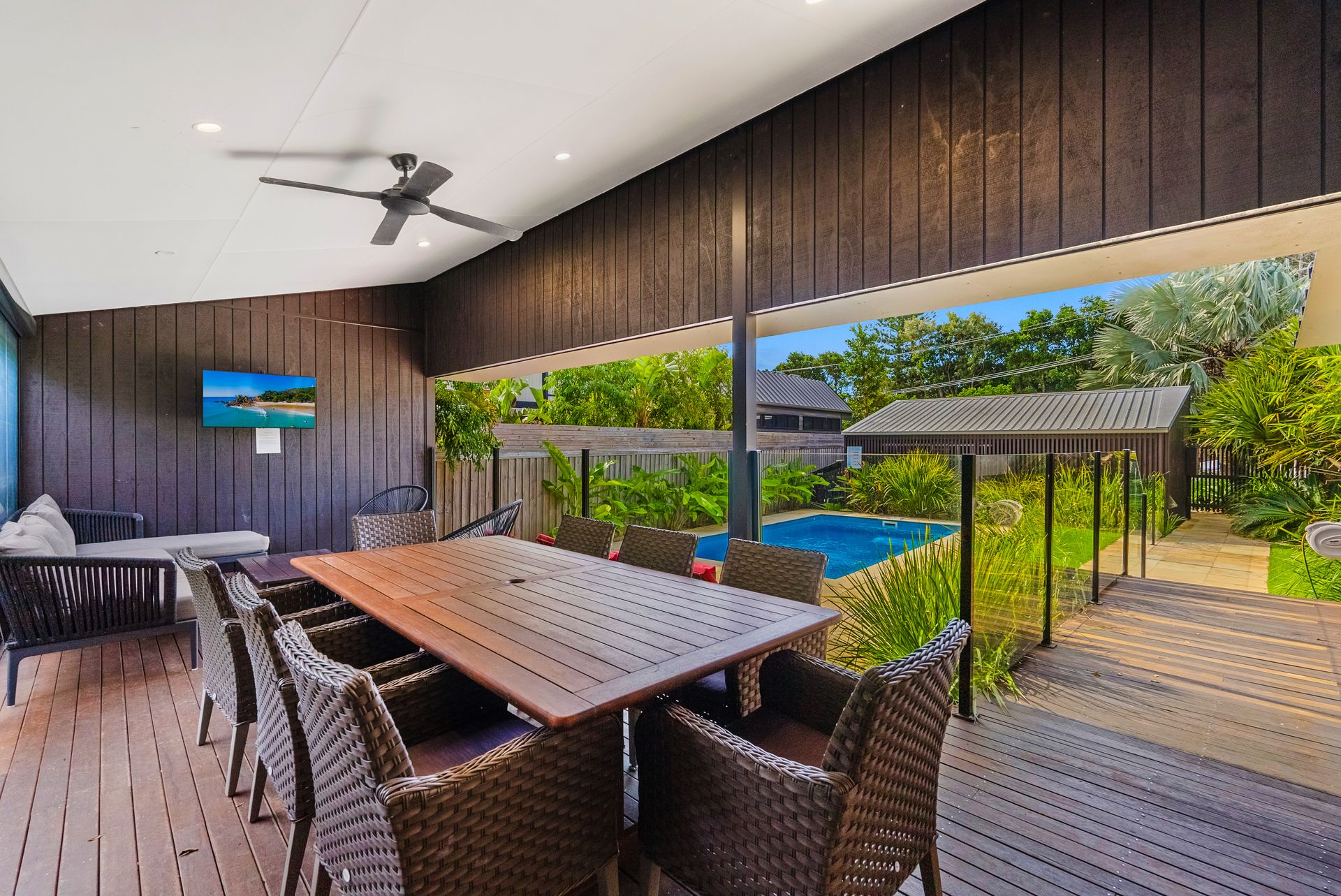 Outdoors, tropical gardens wrap around a sparkling north-facing swimming pool, while a fully fenced yard with a secure gated entry provides a safe and spacious lawn area for children to play.