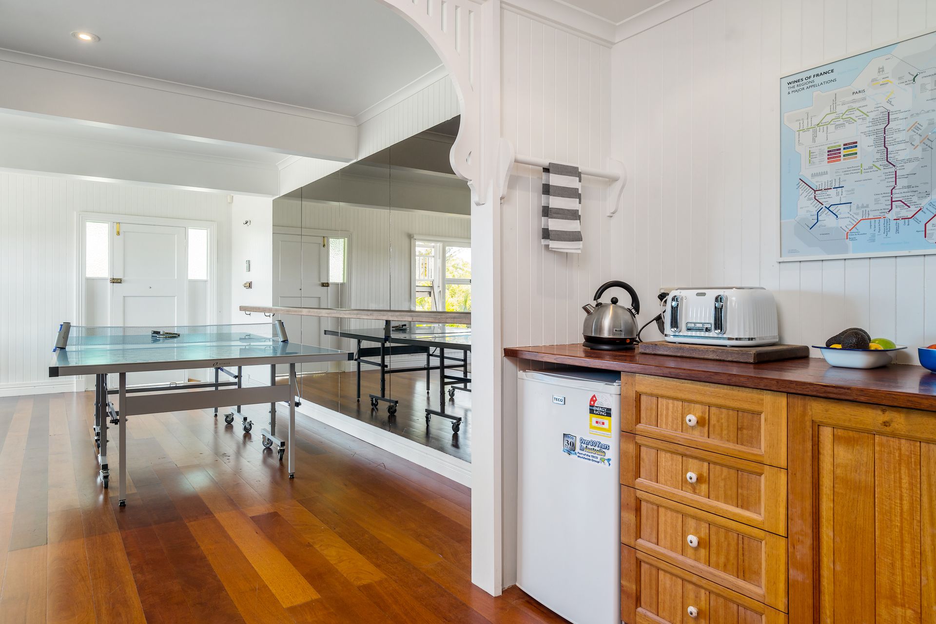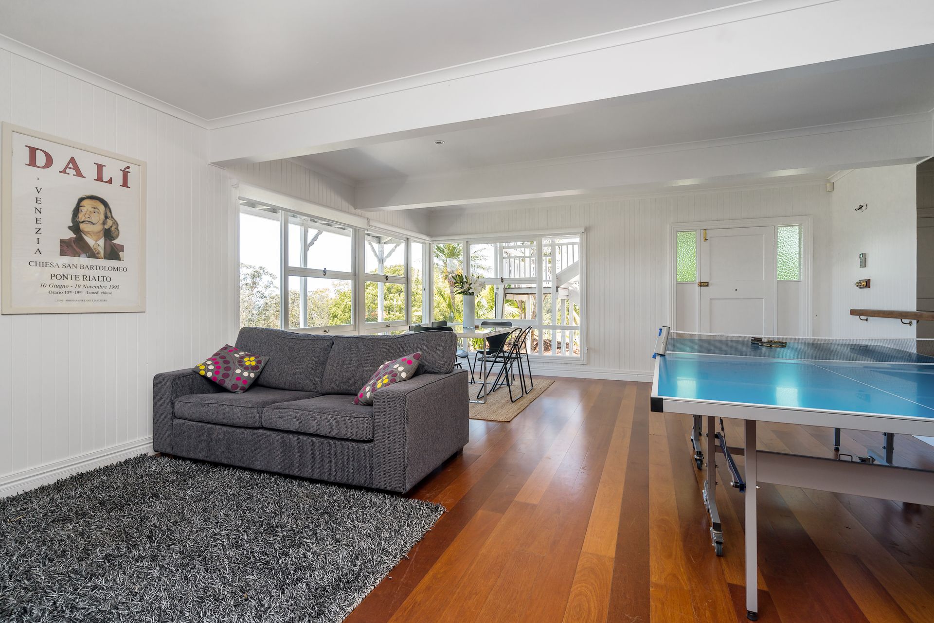 The entire house can easily fit two families. Upstairs comprises of a king size bedroom, 2 queen size bedrooms, a twin single room, sunroom with 2 single beds, spacious main bathroom with freestanding bath and 2nd separate toilet. These rooms spill out onto the large communal living and dining areas. Downstairs is 2nd bathroom, laundry plus a rumpus room with table tennis - a perfect hangout for the kids after a long day at the beach.