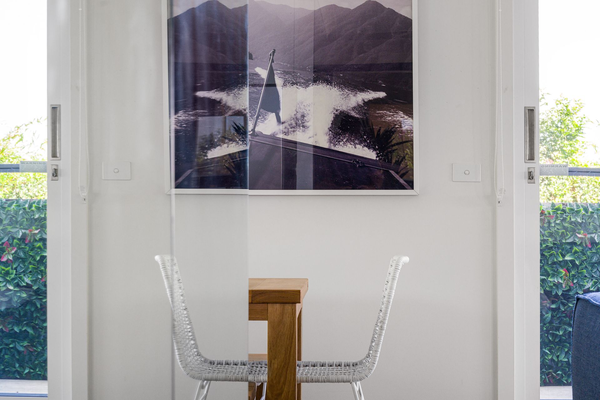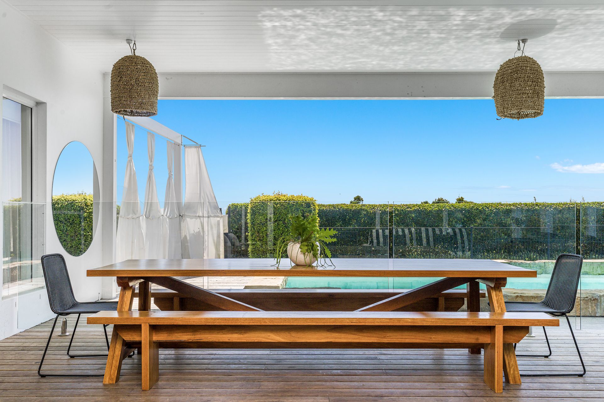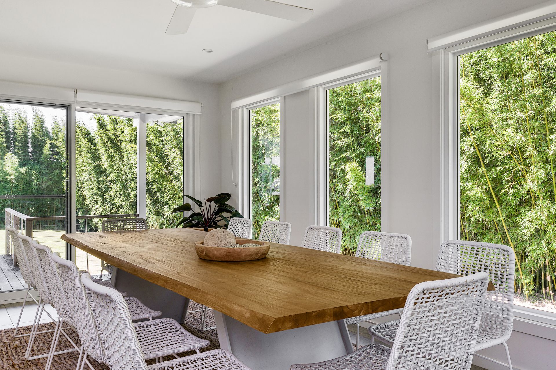 Downstairs, gather for meals in a light-filled atmosphere at the large modern timber and white dining suite within the open-plan living space. Upstairs, an additional timber and white dining suite offers 12-seat dining within the open-plan kitchen area.