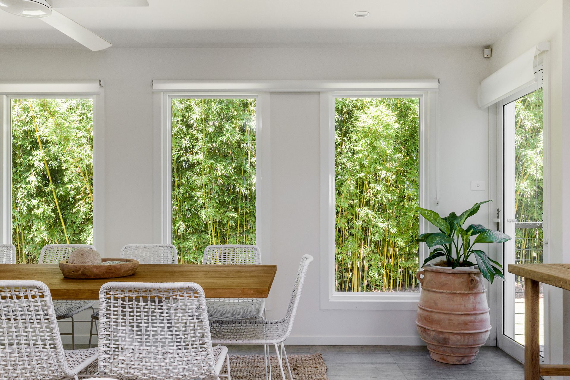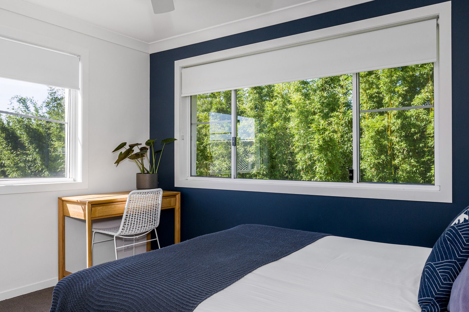 Enjoy the convenience of 4 resort-style bathrooms at Villa St Helena, with an ensuite and guest bathroom on each floor. The bathrooms showcase modern, minimalist style with simple white cabinetry, frameless glass and double shower heads. Relax and unwind after a day exploring Byron in the property's huge stand-alone egg tub with views.
